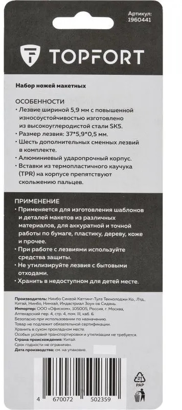 Topfort Нож-скальпель макетный в наборе-25% +58