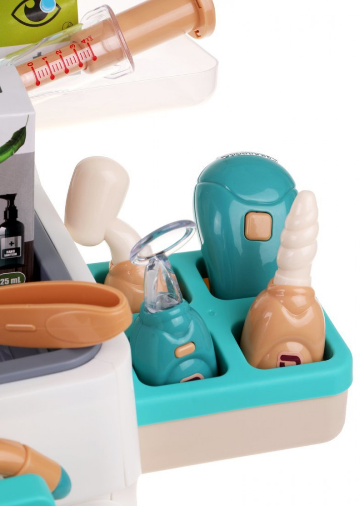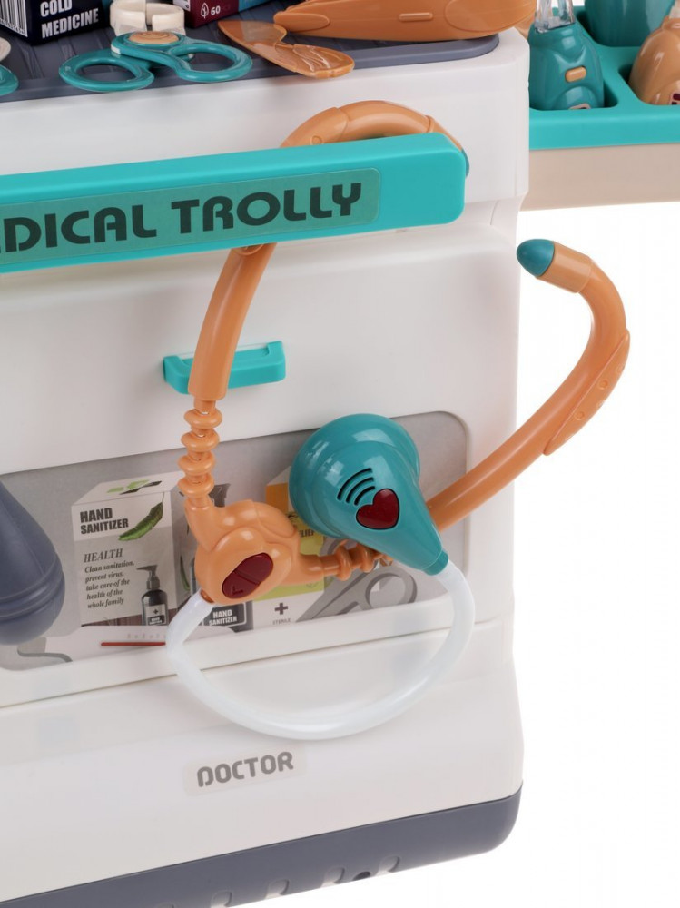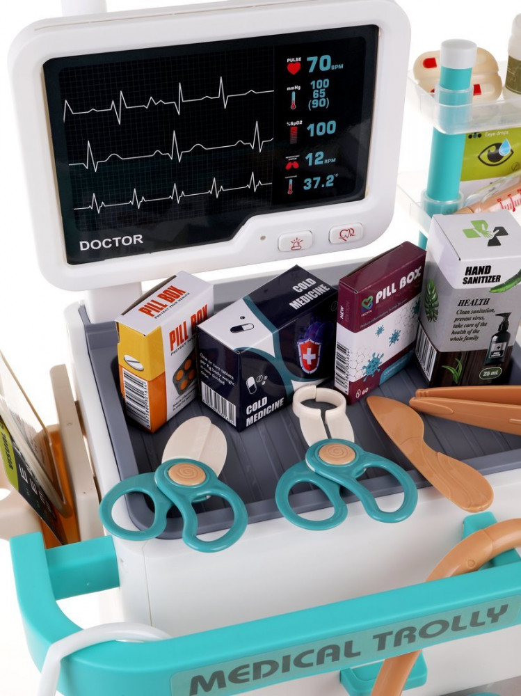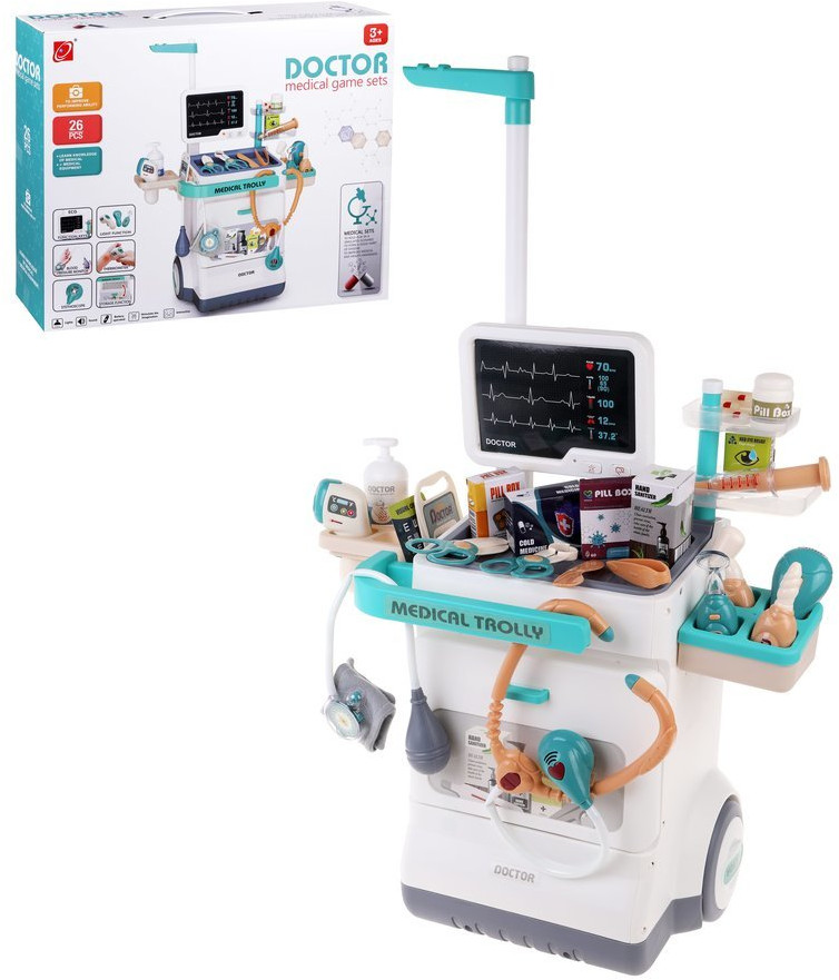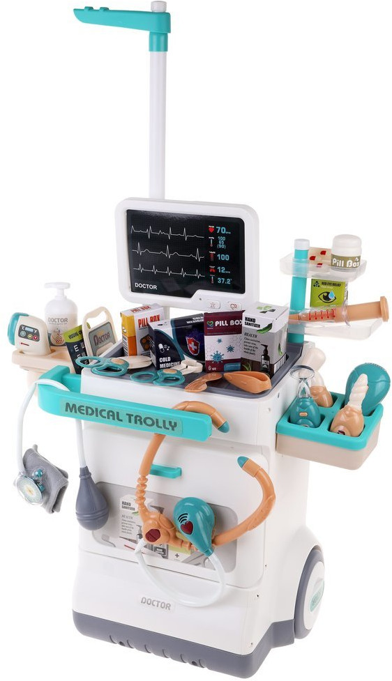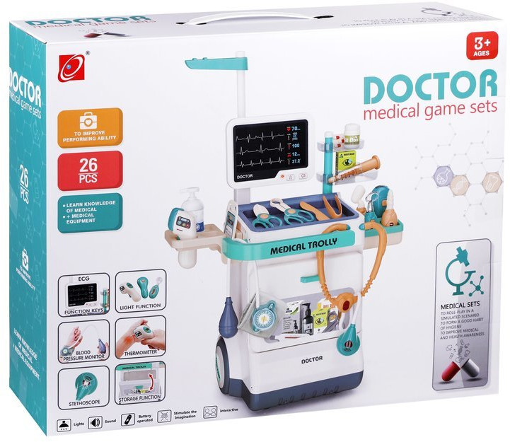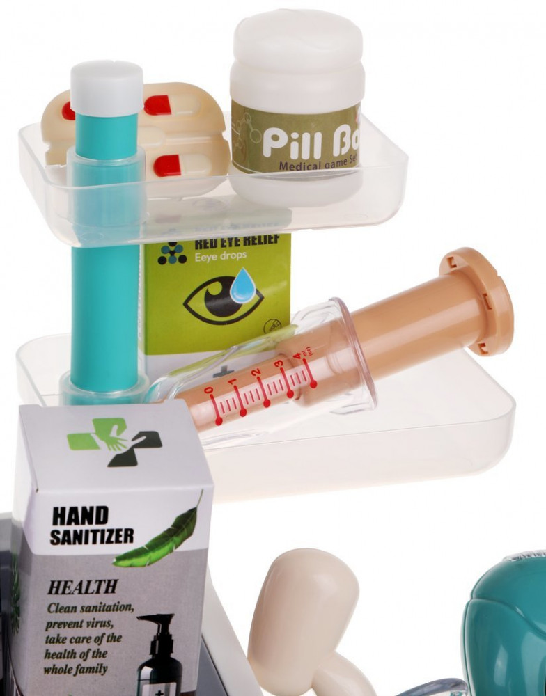 В комплекте 26 предметов: детали для сборки тележки на колесиках, антисептик, безопасные ножницы, 3 картонки с изображениями рентгенологических снимков, 5 коробочек с изображением лекарств, шприц с подвижным поршнем, шпатель, карта пациента, баночка «таблетки», пинцет, блистер с таблетками, зажим, скальпель, механический тонометр (крутится при нажатии на грушу), инструмент стоматолога, зеркало стоматолога с подсветкой, фонарик со светом, картонная таблица для проверки зрения, фонендоскоп с подсветкой и звуком сердцебиения, тонометр (при нажатии на кнопку пикающий звук, мерцает лампочка, температуру можно выставлять вручную), монитор ЭКГ (реалистичные звуки при нажатии на кнопки, мерцает лампочка).
