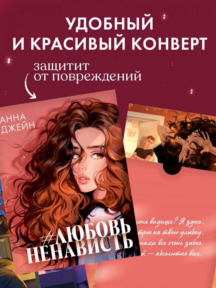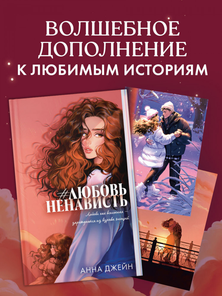 В данный момент этот товар отсутствует в продаже. Возможно, у нас найдется аналогичный или похожий товар здесь. Серия: #Trendbooks_special «Любовь как вселенная. Зарождается из взрыва эмоций». Идеальный подарок поклонникам творчества королевы Young Adult и прекрасное дополнение к культовой дилогии — изящные открытки с самыми романтическими сценами из книги Анны Джейн «#ЛюбовьНенависть». Непревзойденная Карина Яшагина выбрала 15 самых запоминающихся, важных и романтических сцен из первой части истории. Вы увидите портреты главных героев, их шалости в детстве и юности, ссоры, примирение и, конечно, почувствуете любовь, которая пылает в их сердцах.