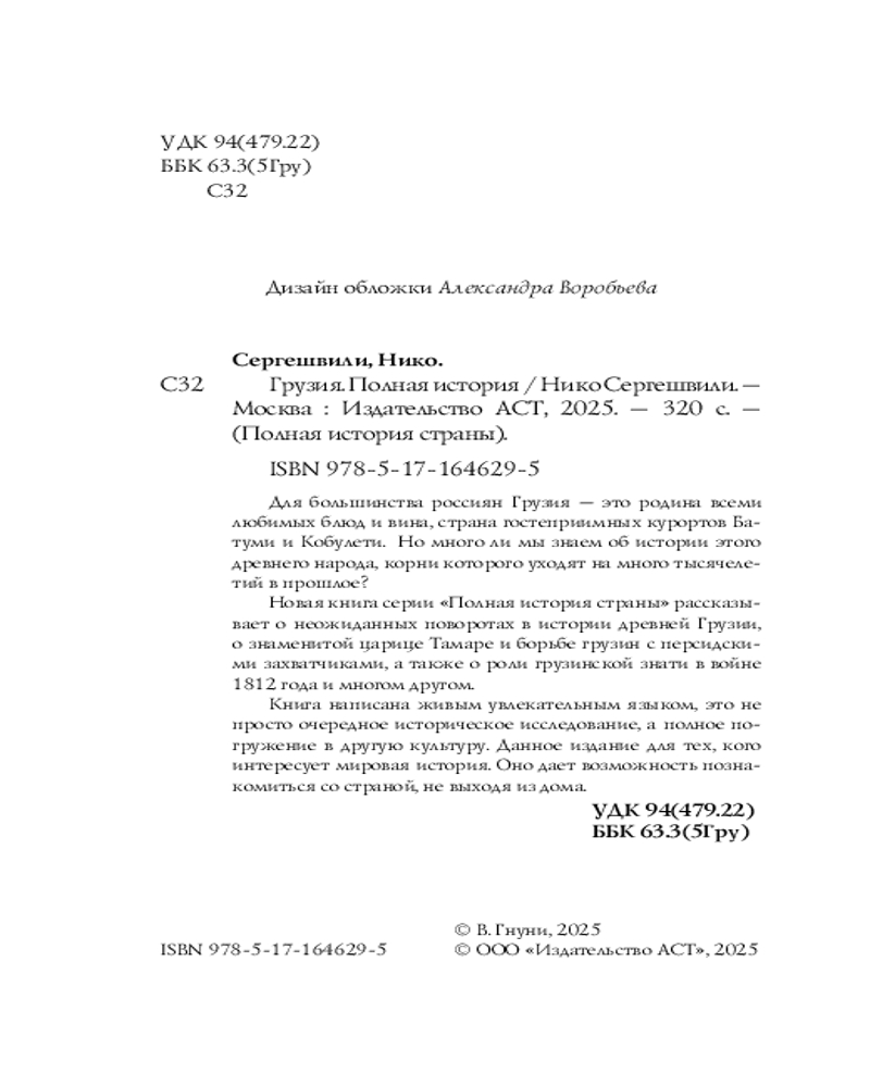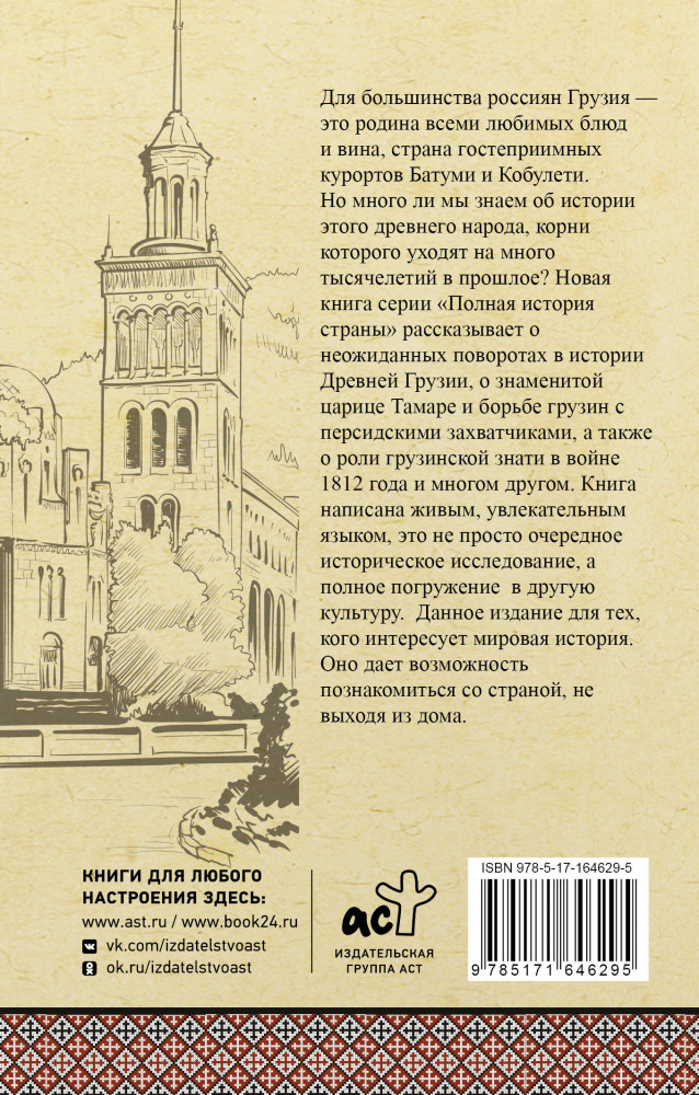 💳 Оплатить за товар можно при получении 🇰🇿 Есть бесплатная доставка по Казахстану от 1 дня 🎁 Копите бонусы с каждой покупки Серия: Полная история страны Для большинства россиян Грузия — это родина всеми любимых блюд и вина, страна гостеприимных курортов Батуми и Кобулети. Но много ли мы знаем об истории этого древнего народа, корни которого уходят на много тысячелетий в прошлое? Новая книга серии «Полная история страны» рассказывает о неожиданных поворотах в истории Древней Грузии, о знаменитой царице Тамаре и борьбе грузин с персидскими захватчиками, а также о роли грузинской знати в войне 1812 года и многом другом. Книга написана живым, увлекательным языком, это не просто очередное историческое исследование, а полное погружение в другую культуру. Данное издание для тех, кого интересует мировая история. Оно дает возможность познакомиться со страной, не выходя из дома. |