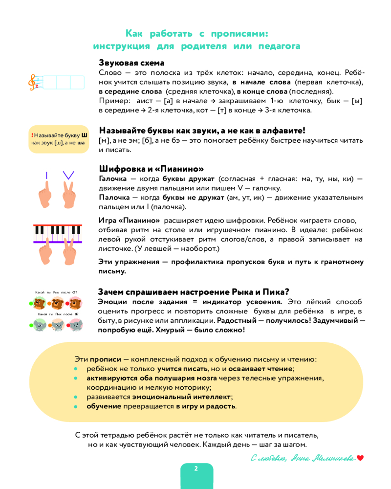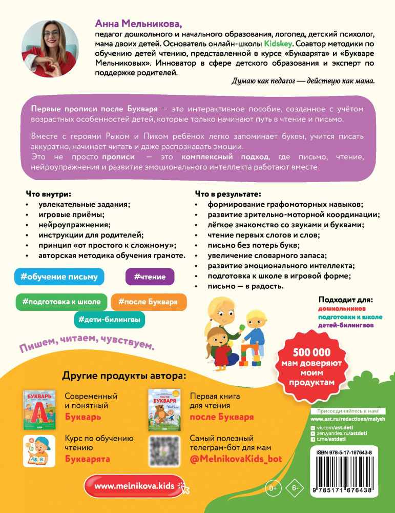 💳 Оплатить за товар можно при получении 🇰🇿 Есть бесплатная доставка по Казахстану от 1 дня 🎁 Копите бонусы с каждой покупки Серия: Суперпрописи для супердетей Освоение навыков письма и чтения — непростой процесс для ребёнка. Поэтому особенно важно сделать занятия не только полезными, но и интересными. Анна Мельникова, педагог, психолог и логопед, знает, как увлечь вашего малыша. Авторская методика игровых заданий поможет ребёнку научиться писать и читать в комфортном режиме. Вместе с непоседливыми героями Рыком и Пиком ребята легко запомнят все буквы, потренируют их написание и чтение. Комплексный подход поможет подготовить малыша к школе и сформировать эмоциональный интеллект. Для начального образования. |