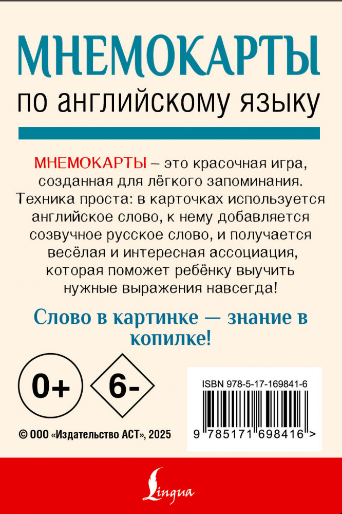 💳 Оплатить за товар можно при получении 🇰🇿 Есть бесплатная доставка по Казахстану от 1 дня 🎁 Копите бонусы с каждой покупки Серия: Эффективные карты для запоминания Мнемокарты — это красочная игра, созданная для лёгкого запоминания. Данные карты основаны на методе ассоциаций и мнемотехнике. Мнемотехника поможет ребёнку в игровой форме запомнить названия животных и растений. Занимаясь всего 10 минут в день, малыш сможет удивить количеством новых выученных слов. Набор содержит 90 иллюстрированных карточек для создания запоминающихся ассоциаций. Мнемокарты помогут развить визуальную память, критическое мышление и творческие способности, делая процесс изучения языка более лёгким и увлекательным! Мнемокарты — это отличный подарок для детей дошкольного и младшего школьного возраста. Карточки можно использовать самостоятельно и в компании, в школе и дома. Слово в картинке — знание в копилке! |