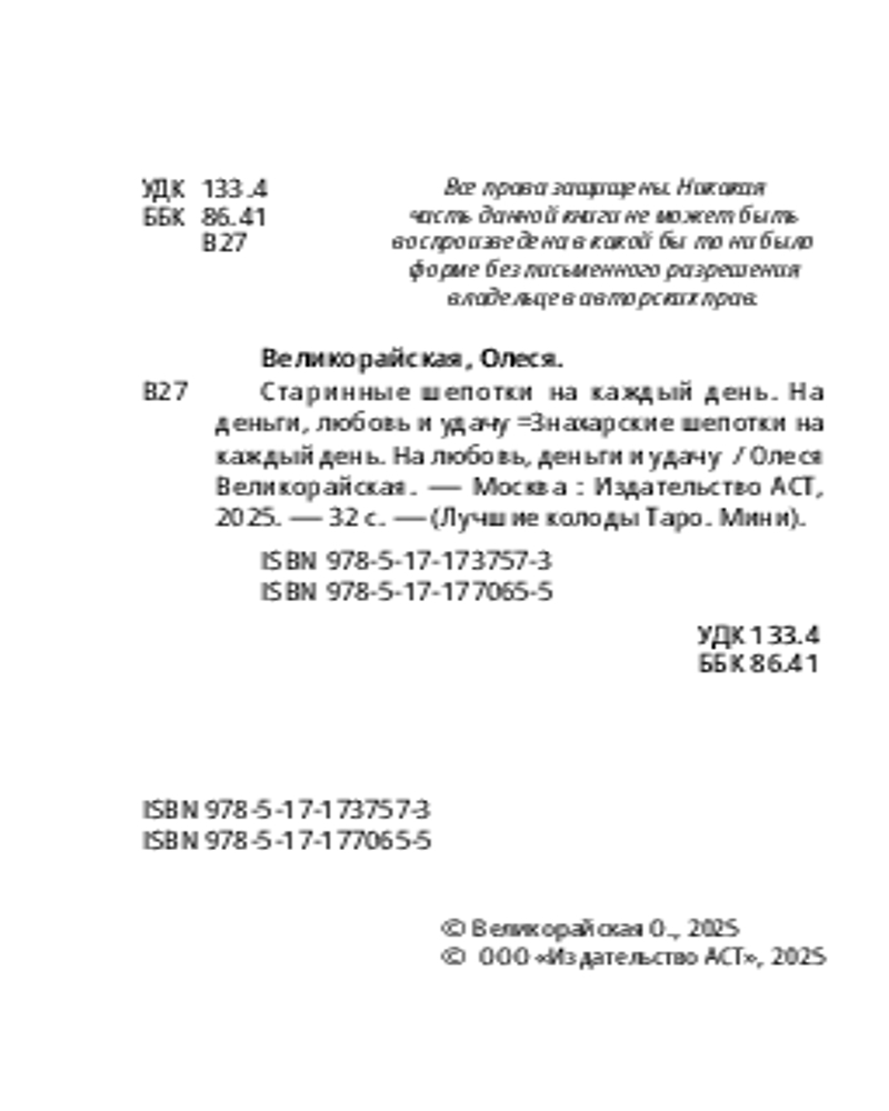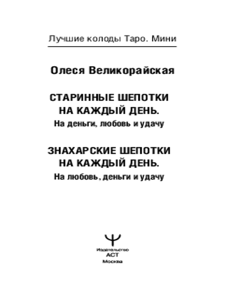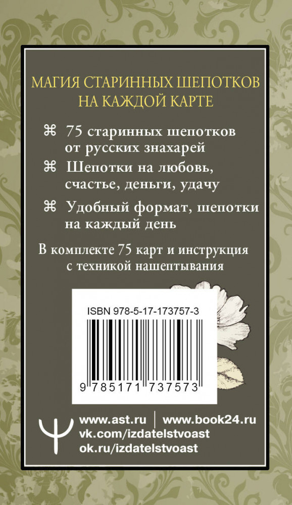 💳 Оплатить за товар можно при получении 🇰🇿 Есть бесплатная доставка по Казахстану от 1 дня 🎁 Копите бонусы с каждой покупки Серия: Лучшие колоды Таро. Мини Первая колода с заговорами-шепотками! На каждой карте старинный заговор для самых разных случаев: привлечение удачи, денег, любви и защита от негативного воздействия. Шепоток создает вибрацию, которая входит в резонанс с энергиями природы, окружающего мира, человека и Вселенной и создает добрую, благоприятную атмосферу для получения желаемого, хорошего самочувствия и настроения. В комплекте с картами есть небольшая брошюра: вы найдете авторские техники Олеси Великорайской, они помогут вам выполнить шепоток правильно, наполнить его силой, не навредить. |