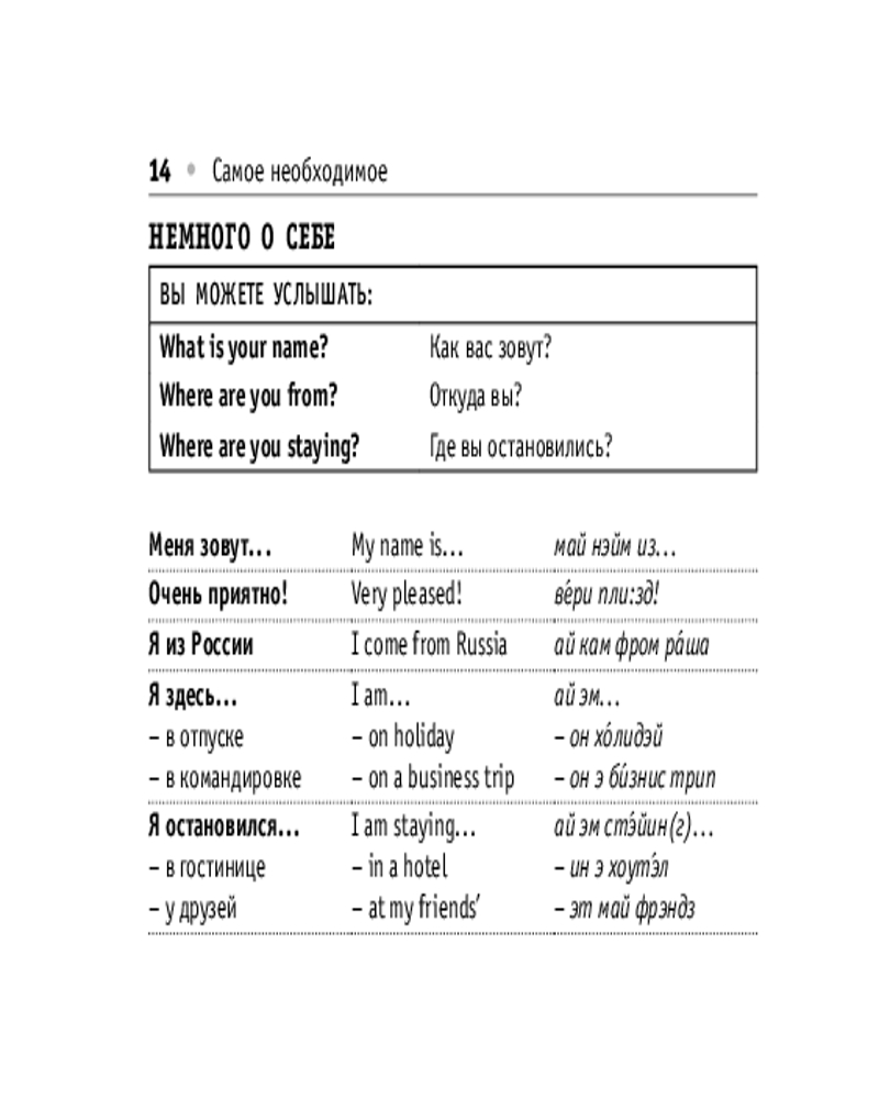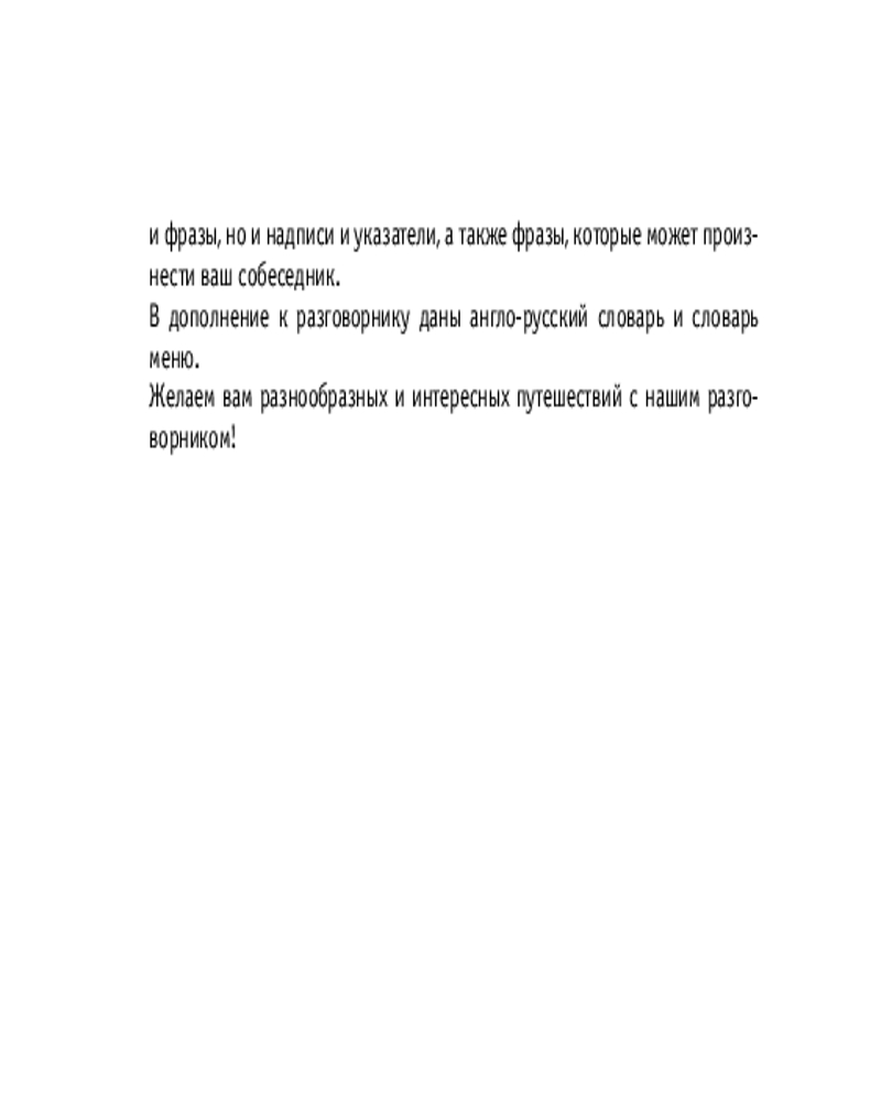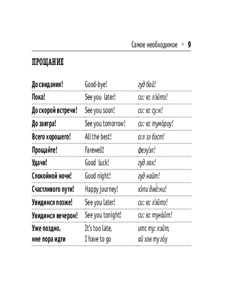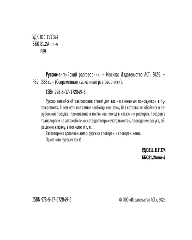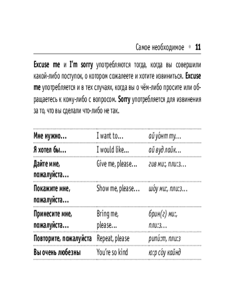 💳 Оплатить за товар можно при получении 🇰🇿 Есть бесплатная доставка по Казахстану от 1 дня 🎁 Копите бонусы с каждой покупки Серия: Современные карманные разговорники Русско-английский разговорник станет для вас незаменимым помощником в путешествиях. В нем есть все самые необходимые темы, без которых не обойтись в зарубежной поездке: проживание в гостинице, поход в магазин и ресторан, поездки в транспорте и на автомобиле, осмотр достопримечательностей, проведение досуга, обращение к врачу, в полицию и т. п. Разговорник дополнен англо-русским словарем и словарем меню. Приятного путешествия! |