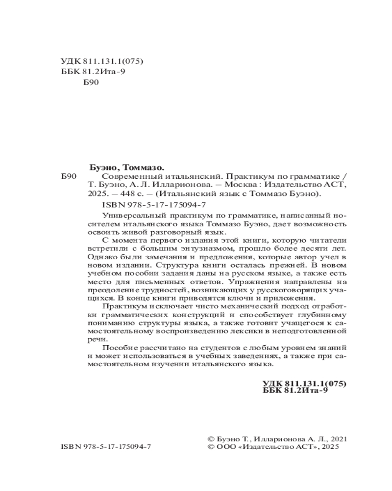💳 Оплатить за товар можно при получении 🇰🇿 Есть бесплатная доставка по Казахстану от 1 дня 🎁 Копите бонусы с каждой покупки Серия: Итальянский язык с Томмазо Буэно Универсальный практикум по грамматике, написанный носителем итальянского языка Томмазо Буэно, дает возможность освоить живой разговорный язык. С момента первого издания этой книги, которую читатели встретили с большим энтузиазмом, прошло более десяти лет. Однако были замечания и предложения, которые автор учел в новом издании. Структура книги осталась прежней. В новом учебном пособии задания даны на русском языке, а также есть место для письменных ответов. Упражнения направлены на преодоление трудностей, возникающих у русскоговорящих учащихся. В конце книги приводятся ключи и приложения. |