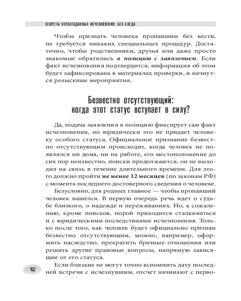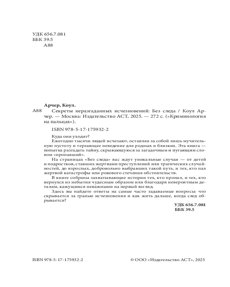 💳 Оплатить за товар можно при получении 🇰🇿 Есть бесплатная доставка по Казахстану от 1 дня 🎁 Копите бонусы с каждой покупки Серия: Криминология на пальцах Куда они уходят? Ежегодно тысячи людей исчезают, оставляя за собой лишь мучительную пустоту и терзающее неведение для родных и близких. Эта книга — попытка разгадать тайну, скрывающуюся за загадочным и пугающим словом «пропавший». На страницах «Без следа» вас ждут уникальные случаи — от детей и подростков, ставших жертвами преступлений или трагических случайностей, до взрослых, добровольно выбравших такой путь, и тех, кто пал жертвой катастрофы или рокового стечения обстоятельств. |