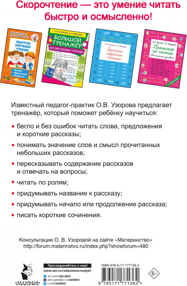 💳 Оплатить за товар можно при получении 🇰🇿 Есть бесплатная доставка по Казахстану 🎁 Копите бонусы с каждой покупки Серия: Тренажер для начальной школы Благодаря «Тренажёру по скорочтению» известного педагога-практика О. В. Узоровой ребёнок освоит чтение слов, предложений и коротких рассказов. Выполняя задания, первоклассник научится усваивать прочитанные небольшие рассказы, отвечать на вопросы и пересказывать содержание. Для начального образования. |