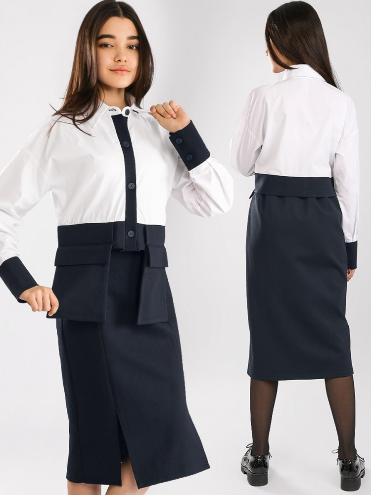 блузка 100% хлопок, юбка 73% хлопок, 22 % полиэстер, 5% полиуретан