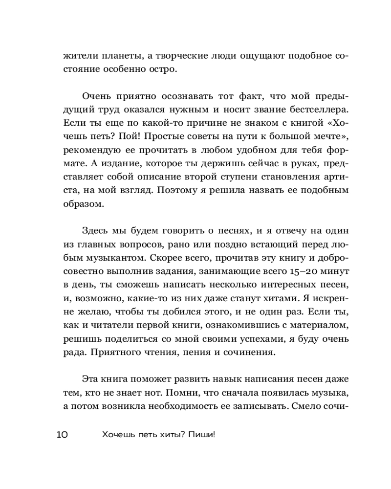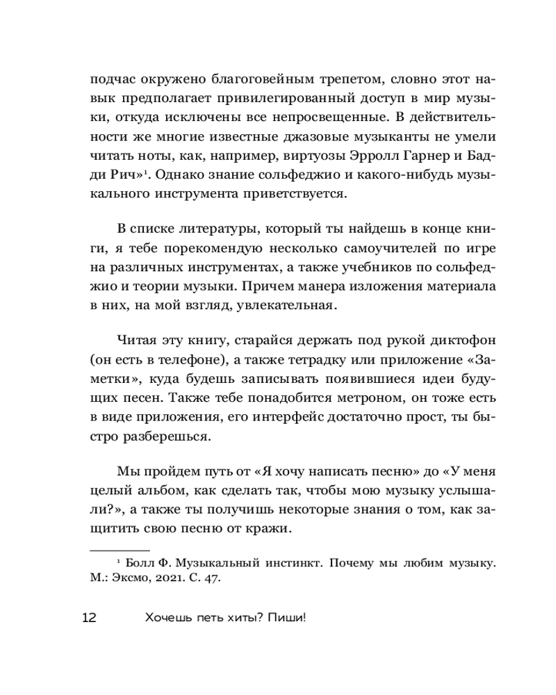Серия: Музыкант PRO: книги для тех, кто хочет стать профессионалом в индустрии В книге вы найдете все инструменты для написания песен даже в случае, если вы пока не знакомы с миром нот. Вместе с автором вы пройдете увлекательный путь от «Я хочу написать песню» до «У меня целый альбом, как сделать так, чтобы мою музыку услышали?», а также получите полезные знания о теории музыки, авторском праве и, конечно, советы от опытных звезд российской эстрады. Кроме того, в конце книги вы найдете список полезной литературы для усовершенствования навыков сонграйтера: рекомендуемые автором самоучители по игре на различных музыкальных инструментах, а также учебники по сольфеджио и теории музыки, таблицы с аккордами для гитары и фортепиано. Вооружитесь местом для ведения заметок, диктофоном, метрономом и, главное, желанием и усердием — и ваш первый хит не заставит себя ждать! |
