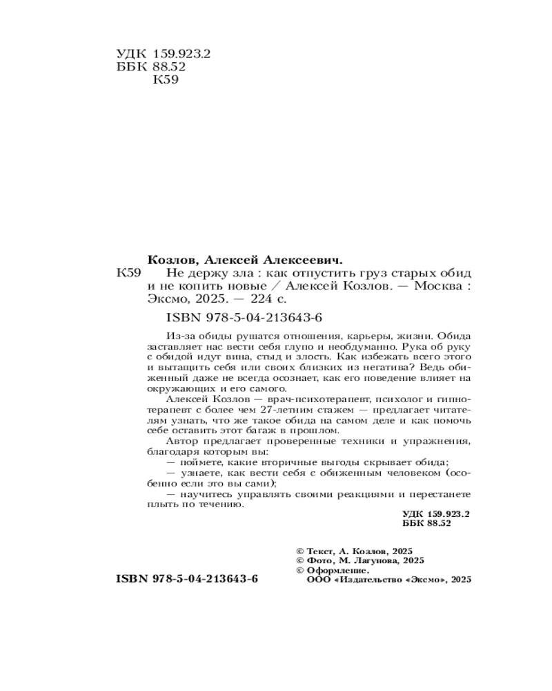 💳 Оплатить за товар можно при получении 🇰🇿 Есть бесплатная доставка по Казахстану от 1 дня 🎁 Копите бонусы с каждой покупки Серия: Top expert. Практичные книги для работы над собой Из-за обиды рушатся отношения, карьеры, жизни. Обида заставляет нас вести себя глупо и необдуманно. Рука об руку с обидой идут вина, стыд и злость. Как избежать всего этого и вытащить себя или своих близких из негатива? Ведь обиженный даже не всегда осознает, как его поведение влияет на окружающих и его самого. Алексей Козлов, врач-психотерапевт, психолог и гипнотерапевт с более чем 27-летним стажем, предлагает читателям узнать, что же такое обида на самом деле и как помочь себе оставить этот багаж в прошлом. |