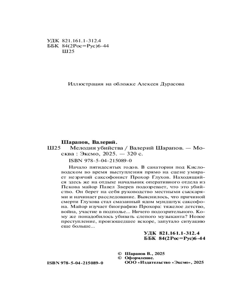 💳 Оплатить за товар можно при получении 🇰🇿 Есть бесплатная доставка по Казахстану от 1 дня 🎁 Копите бонусы с каждой покупки Серия: Тревожная весна 45-го. Послевоенный детектив Начало пятидесятых годов. В санатории под Кисловодском во время выступления прямо на сцене умирает незрячий саксофонист Прохор Глухов. Находящийся здесь же на отдыхе начальник оперативного отдела из Пскова майор Павел Зверев подозревает, что это убийство. Он берет на себя руководство местными сыскарями и начинает расследование. Выяснилось, что причиной смерти Глухова стал смазанный ядом мундштук саксофона. Майор изучает биографию Прохора: тяжелое детство, война, участие в подполье... Ничего подозрительного. Кому же понадобилось убивать слепого музыканта? Новое преступление, произошедшее вскоре, запутало ситуацию еще больше... |