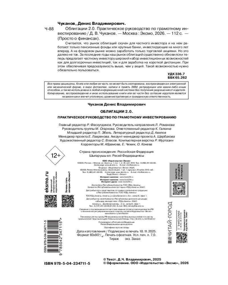 💳 Оплатить за товар можно при получении 🇰🇿 Есть бесплатная доставка по Казахстану от 1 дня 🎁 Копите бонусы с каждой покупки Серия: Просто о финансах Считается, что рынок облигаций скучен для частного инвестора и на нем работают только пенсионные фонды или крупные банки, инвестирующие на много лет вперед. А на фондовом рынке можно заработать только торговлей акциями. Но это далеко не так. За последние годы наш рынок облигаций существенно обновился и теперь предлагает частному инвестору широкий набор инвестиционных возможностей как для долгосрочных инвестиций, так и для заработка на короткой дистанции. При этом обеспечивая предсказуемость выше, чем у акций. Такой возможностью нужно обязательно пользоваться. |