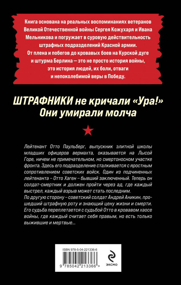 💳 Оплатить за товар можно при получении 🇰🇿 Есть бесплатная доставка по Казахстану от 1 дня 🎁 Копите бонусы с каждой покупки Серия: Искупить кровью. Военные романы о штрафниках Лейтенант Отто Паульберг, выпускник элитной школы младших офицеров вермахта, оказывается на Лысой Горе, ничем не примечательном, но смертоносном участке фронта. Здесь его подразделение сталкивается с яростным сопротивлением советских войск. Один из подчиненных лейтенанта — Отто Хаген — бывший заключенный. Теперь он солдат-смертник, и он должен пройти через ад, где каждый выстрел, каждый взрыв может стать последним. По другую сторону — советский солдат Андрей Аникин, прошедший штрафную роту и знающий цену жизни и смерти. Его судьба переплетается с судьбой Отто в кровавом хаосе войны, где каждый считает себя правым, но есть только выжившие и мертвые... В этой истории нет места пафосу или романтике — только грязь окопов, холод донских ночей и грохот артиллерии. Кто выживет в этом хаосе? |
