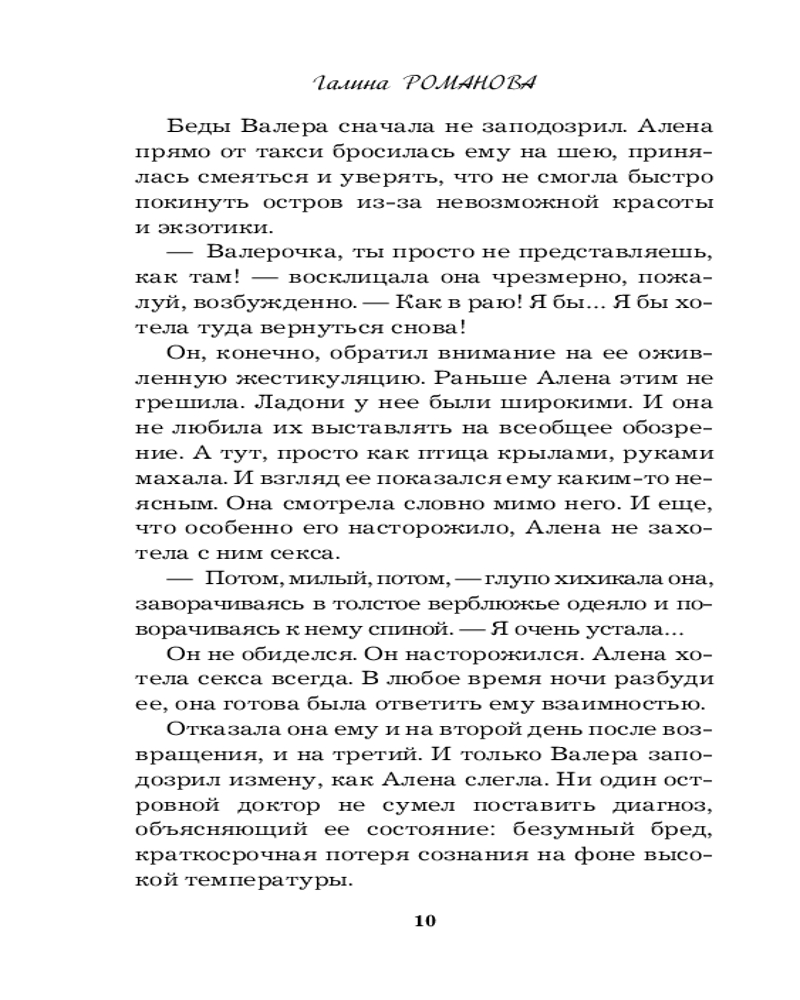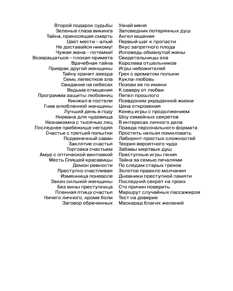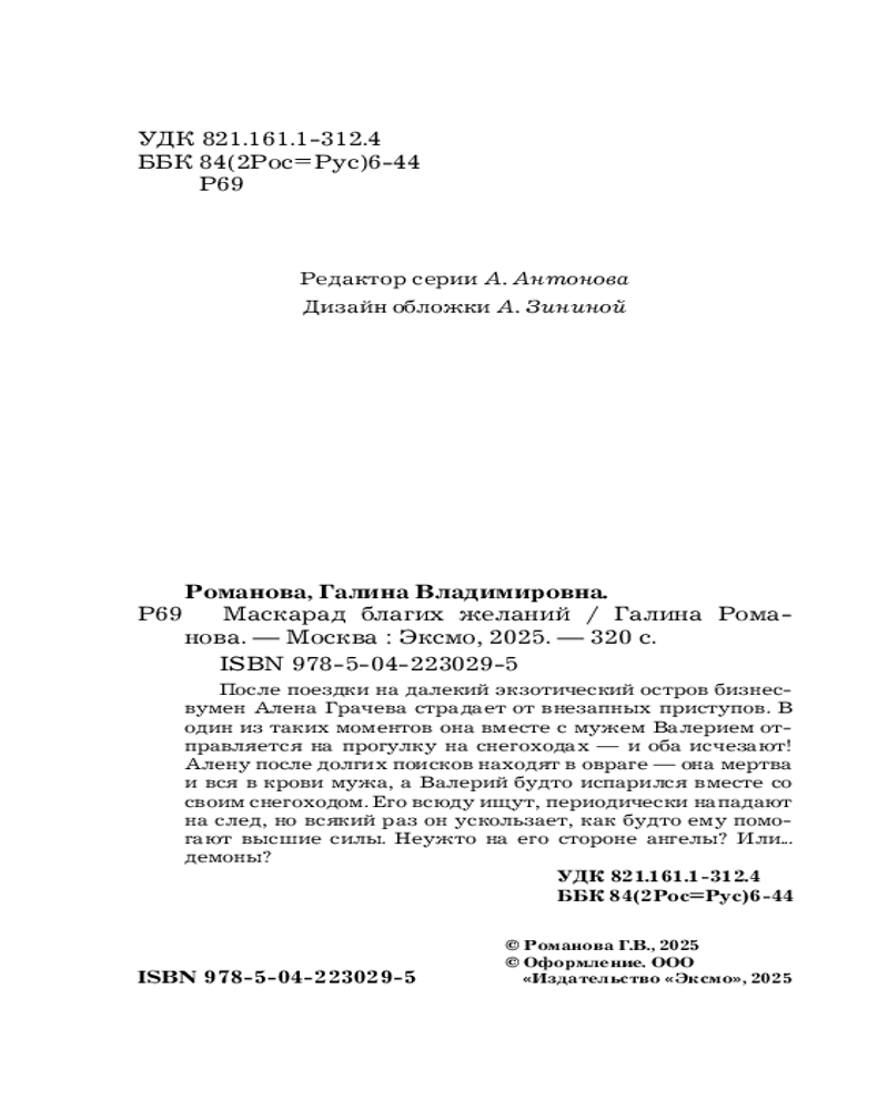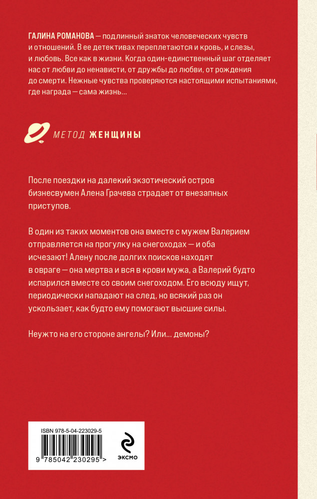 💳 Оплатить за товар можно при получении 🇰🇿 Есть бесплатная доставка по Казахстану от 1 дня 🎁 Копите бонусы с каждой покупки Серия: Детективы Галины Романовой. Метод Женщины. Новое оформление После поездки на далекий экзотический остров бизнесвумен Алена Грачева страдает от внезапных приступов. В один из таких моментов она вместе с мужем Валерием отправляется на прогулку на снегоходах — и оба исчезают! Алену после долгих поисков находят в овраге — она мертва и вся в крови мужа, а Валерий будто испарился вместе со своим снегоходом. Его всюду ищут, периодически нападают на след, но всякий раз он ускользает, как будто ему помогают высшие силы. Неужто на его стороне ангелы? Или... демоны? |