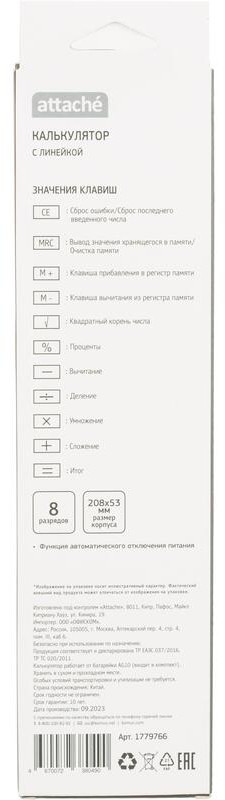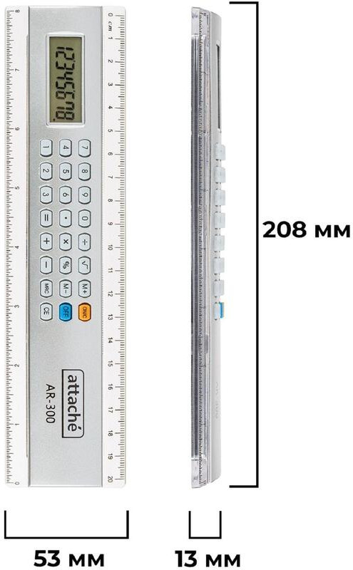 💳 Оплатить за товар можно при получении 🇰🇿 Есть бесплатная доставка по Казахстану от 1 дня 🎁 Копите бонусы с каждой покупки Калькулятор Attache настольный с линейкой AR-300 с 10+2-разрядным дисплеем. Калькулятор встроен в линейку, что делает его незаменимым помощником при вычислениях и чертежах. Корпус и кнопки изготовлены в сером цвете из качественного пластика. Оптимальный набор вычислительных функций, среди которых: расчет процентов, расчет квадратного корня, независимая память (M+, M-, MRC). |