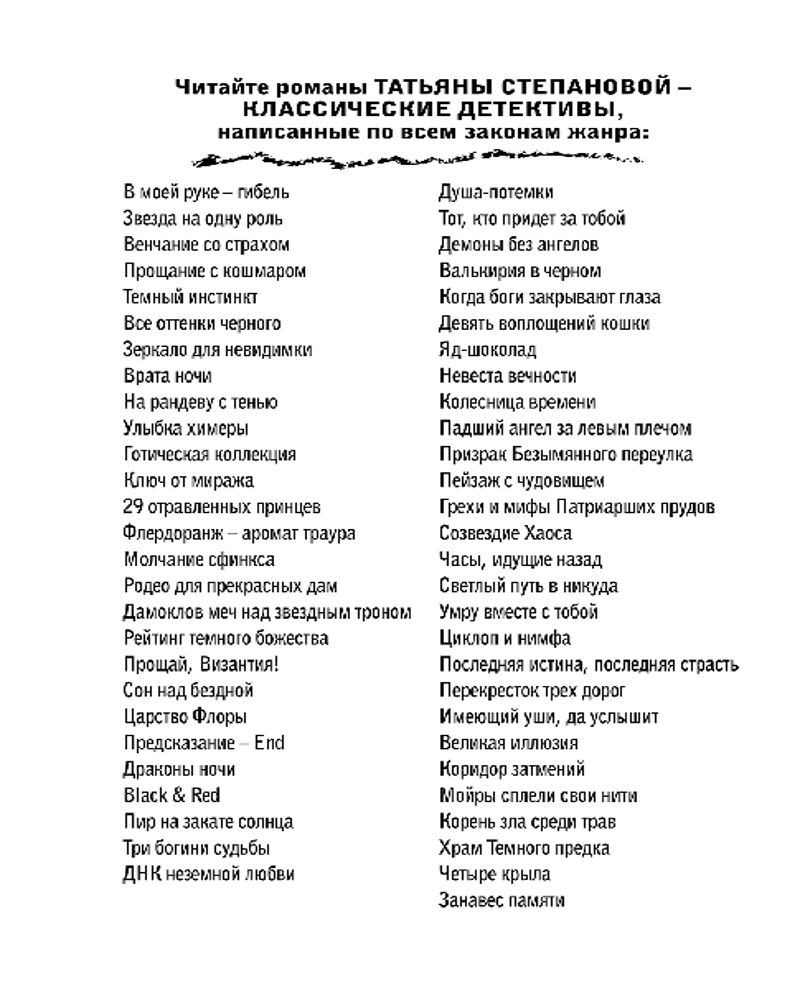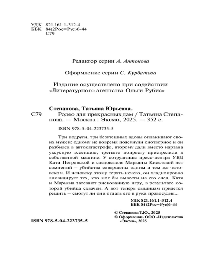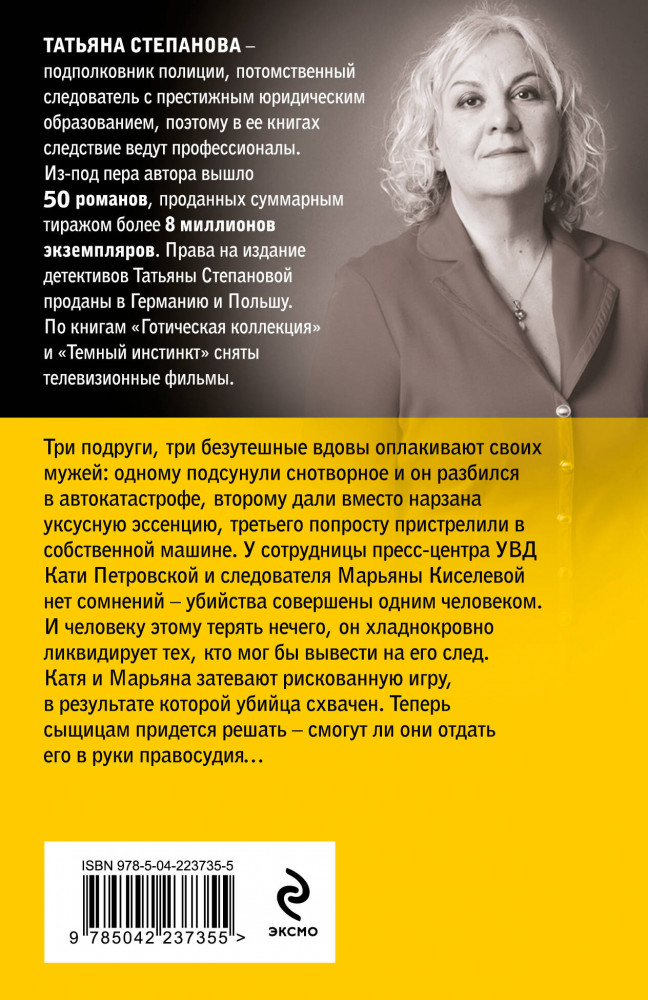 💳 Оплатить за товар можно при получении 🇰🇿 Есть бесплатная доставка по Казахстану 🎁 Копите бонусы с каждой покупки Серия: По следам громких дел. Детективы Т. Степановой. Новое оформление (обложка) Три подруги, три безутешные вдовы оплакивают своих мужей: одному не вовремя подсунули снотворное и он разбился в автокатастрофе, второму дали вместо нарзана уксусную эссенцию, третьего попросту пристрелили в собственной машине. У сотрудницы Пресс-центра УВД Кати Петровской и следователя Марьяны Киселевой нет сомнений — убийства совершены одним и тем же человеком. И человеку этому терять нечего, он хладнокровно ликвидирует тех, кто мог бы вывести на его след. Катя и Марьяна затевают рискованную игру, в результате которой убийца схвачен. А вот теперь сыщицам придется решить — смогут ли они отдать его в руки правосудия... |