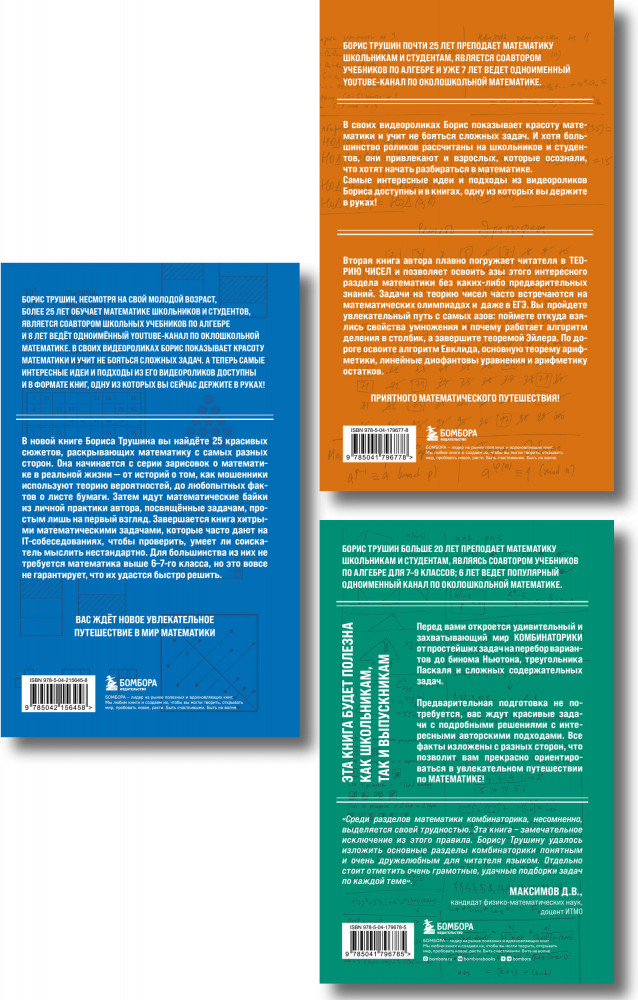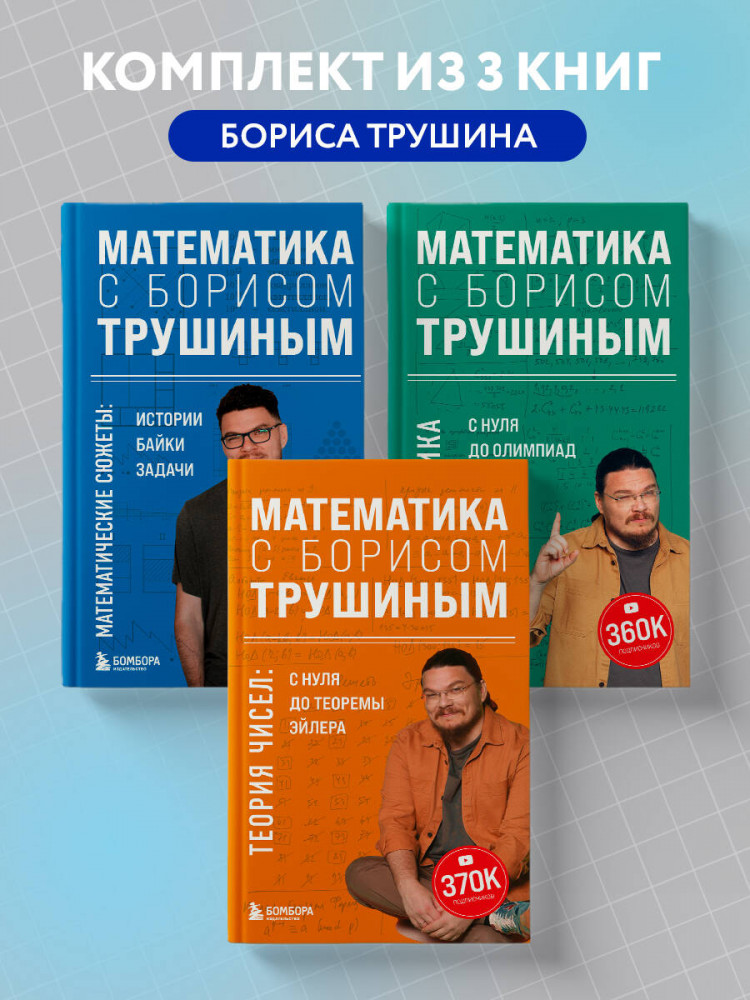 В данный момент этот товар отсутствует в продаже. Возможно, у нас найдется аналогичный или похожий товар здесь. Серия: Математика с Борисом Трушиным Комплект из трех книг известного математического блогера Бориса Трушина: «Комбинаторика: с нуля до олимпиад» + «Теория чисел: с нуля до теоремы Эйлера» +«Математические сюжеты: истории, байки, задачи». Интересные и необычные задачи помогут освоить эти разделы математики с нуля и до олимпиадного уровня. От простейших задач на перебор вариантов и алгоритма деления в столбик вы двинетесь к биному Ньютона, треугольнику Паскаля, к теореме Эйлера и числам Фибоначчи. Борис Трушин разбирает задачи, которые часто встречаются и на олимпиадах, и на ЕГЭ, а для тех, кто хочет проверить себя, в конце предоставлены подробные решения.