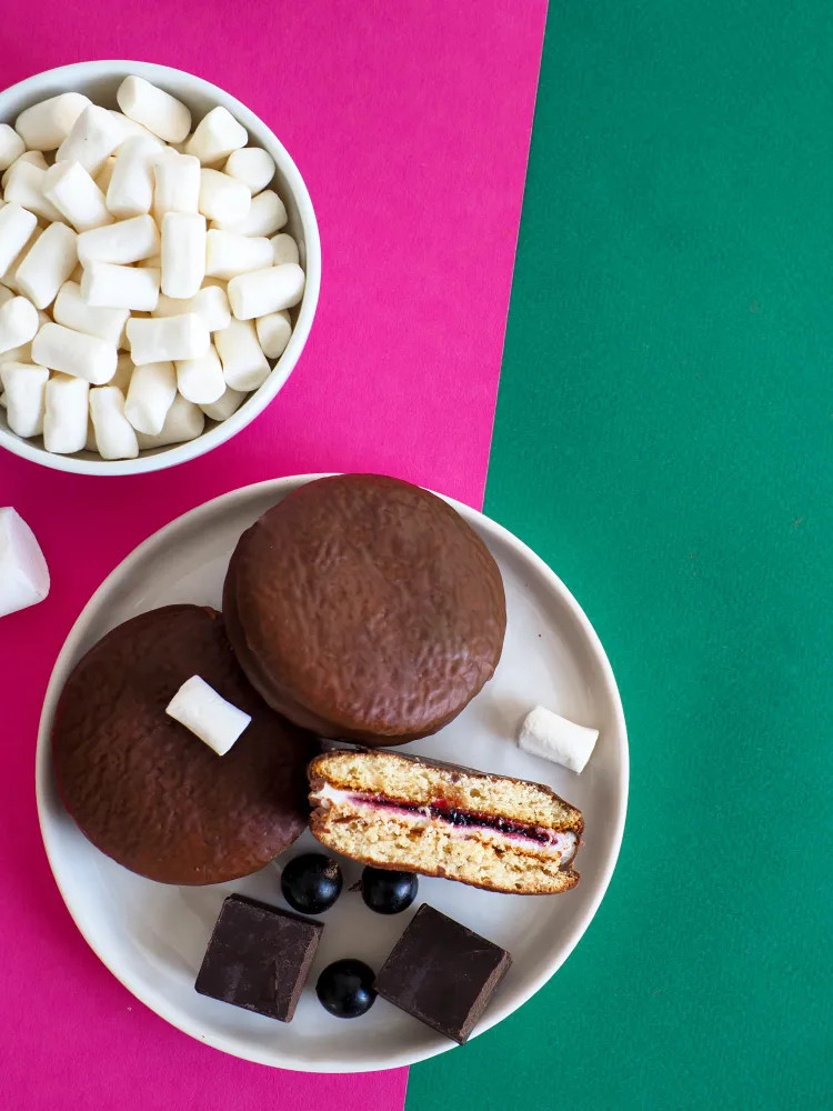 Мука пшеничная общего назначения тип М 55-23, сахар, вода питьевая, патока, жир кондитерский (рафинированные дезодорированные растительные масла (пальмовое, подсолнечное, соевое), эмульгатор (лецитин соевый), антиокислители (Е319, лимонная кислота)), фруктовый наполнитель "Черная смородина" (сахар, черная смородина, глюкозный сироп, вода питьевая, загустители (пектины, ксантановая камедь), регуляторы кислотности (лимонная кислота, аскорбиновая кислота, цитрат натрия 3-замещенный, цитрат кальция), ароматизатор натуральный "Черная смородина", консервант (сорбат калия)), жир специального назначения (рафинированные дезодорированные растительные масла (пальмовое, пальмоядровое, ши), эмульгаторы (лецитин соевый, сорбитан тристеарат)), молоко сухое цельное, яичные продукты, какао-порошок, лактоза, влагоудерживающий агент (глицерин), разрыхлители (гидрокарбонат аммония, гидрокарбонат натрия, ортофосфат кальция 1-замещенный), глюкоза, желатин пищевой, соль, шоколадная крошка (сахар, молоко сухое цельное, какао тертое), какао тертое, ароматизаторы, молочный белок, загуститель (ксантановая камедь), эмульгатор (лецитин соевый).
