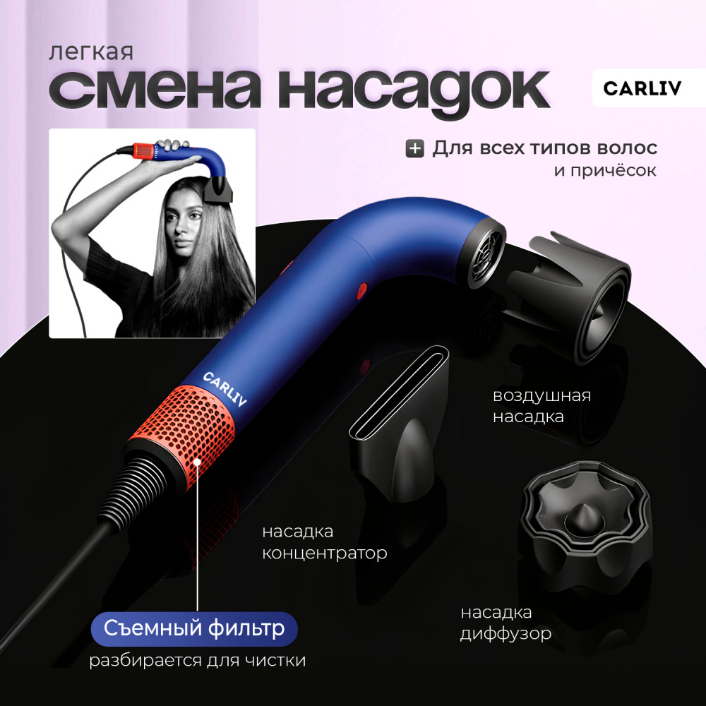 💳 Оплатить за товар можно при получении 🇰🇿 Есть бесплатная доставка по Казахстану от 1 дня 🎁 Копите бонусы с каждой покупки Новый фен Carliv имеет инновационный дизайн, основанный на оригинальной модели. R-образная конструкция обеспечивает быстрый, бережный и точно контролируемый обдув. Оригинальный дизайн — не единственное, что может предложить фен Carliv — фен создает мощный, направленный поток воздуха, который равномерно нагревает волосы, обеспечивая идеальный вид. Специальная форма корпуса фена обеспечивает простоту использования, а также исключает возможность случайного повреждения: при использовании фена ваши волосы не будут выдергиваться или повреждаться в процессе сушки феном. Благодаря технологии под Dyson Air — поток воздуха равномерно нагревает локоны, не пересушивая их и сохраняя их естественную влажность. Изогнутая форма распределяет воздух во всех направлениях, исключая образование холодных или перегретых зон. |