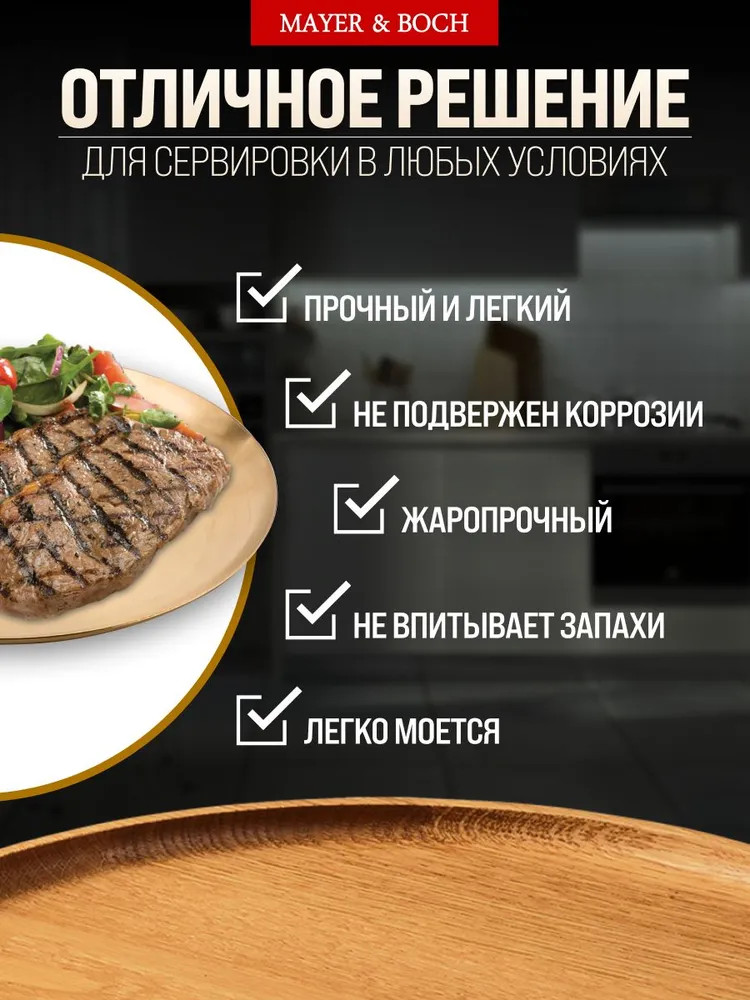 Представьте себе элегантный поднос, сверкающим золотым блеском. Изготовленный из высококачественной нержавеющей стали, он станет прекрасным дополнением к вашей кухне и поможет создать неповторимую атмосферу во время сервировки стола. Его прочная конструкция гарантирует долговечность, а стильный дизайн идеально подходит для презентации самых разных угощений. На этом подносе можно с изыском подать закуски, сладкие десерты, сочные фрукты или напитки. Благодаря практичности и красивому внешнему виду, он станет незаменимым помощником как на повседневной кухне, так и во время торжественных мероприятий.