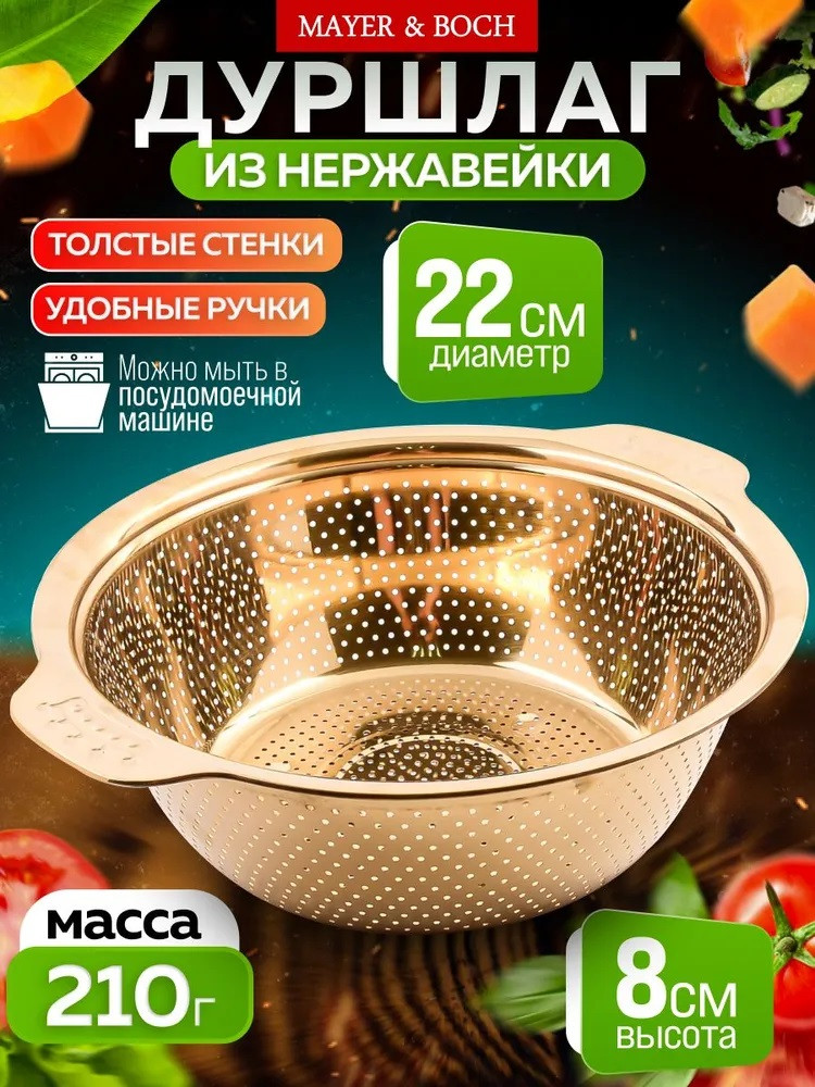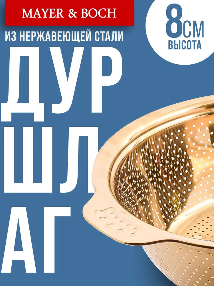 Металлический дуршлаг круглой формы от Mayer & Boch — это надёжное и функциональное решение для вашей кухни! Стильный дизайн и прочность нержавеющей стали делают его незаменимым помощником в приготовлении вкусной пищи. Он соответствует гигиеническим стандартам и требованиям. Продукты, попадая в дуршлаг, начинают танцевать весёлый танец, добавляя радости в процесс готовки. Этот кухонный аксессуар подходит для сливания водички с варенных овощей, макаронов, риса и прочего. Он также подходит для промывания мелких ягодок, таких как смородинка, вишня, клубничка, малинка.