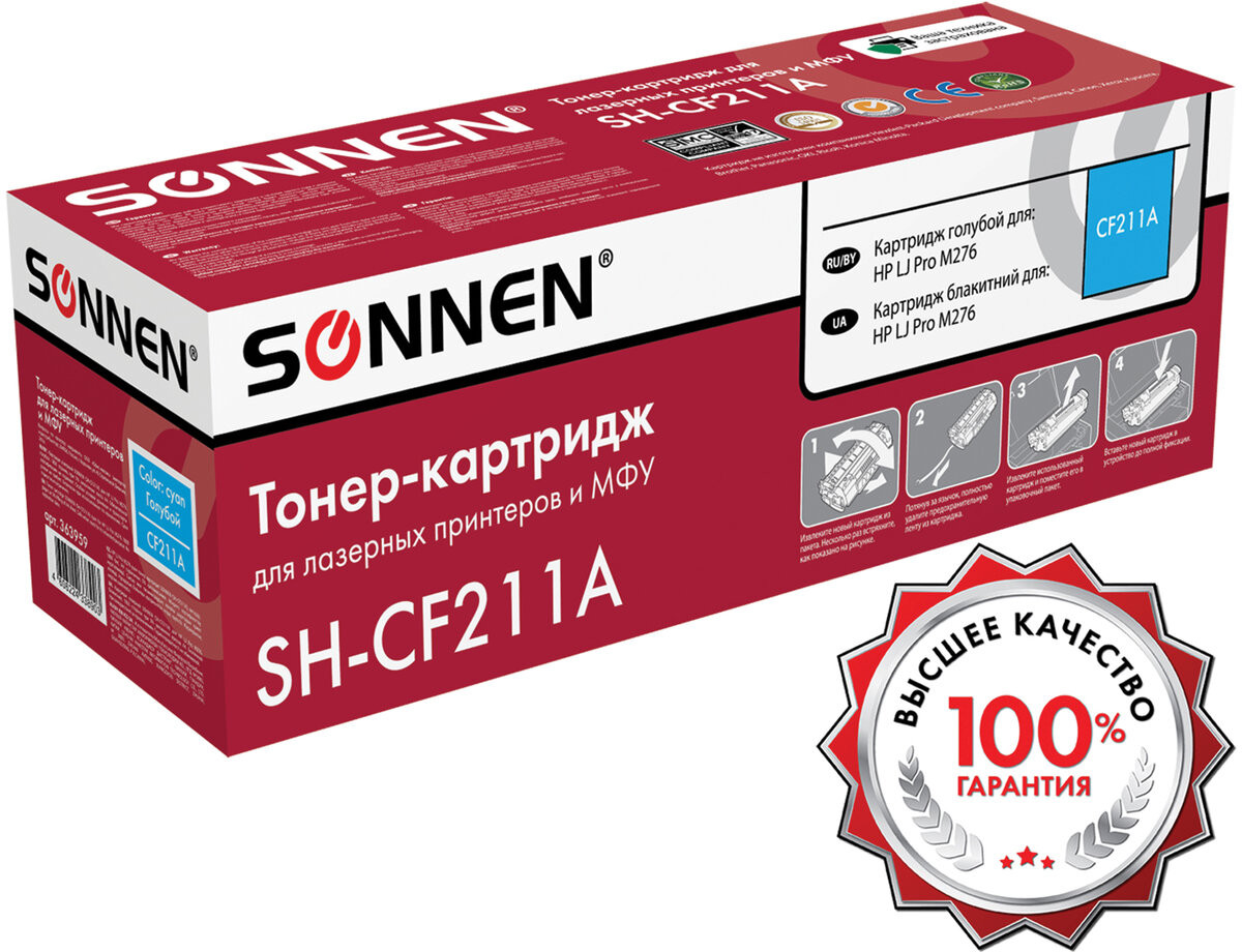 Совместимый картридж Sonnen (SH-CF211A) для HP Color Laser Jet M251n/251nw M276n. Совместимые лазерные картриджи SONNEN – это оригинальное качество по доступной цене. Данная модель содержит ЧИП, подходит для лазерных принтеров и МФУ: HP LaserJet Pro 200 color Printer M251n/M251nw/MFP M276n/M276nw; Canon i-SENSYS LBP-7100CN/LBP-7110CW/LBP-7100C. Ресурс – 1800 страниц.