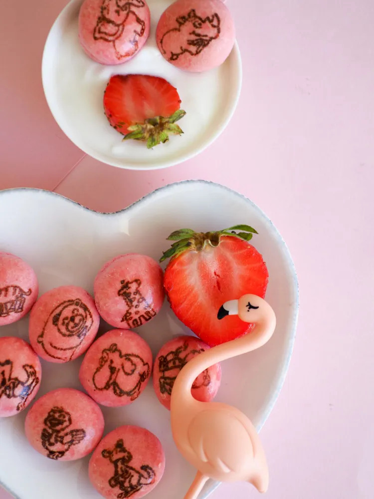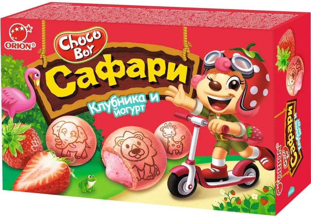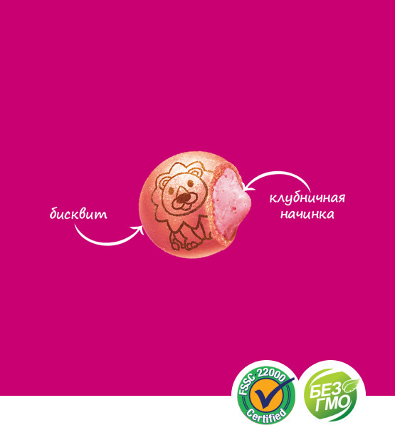 Глазурь жировая (сахар, масла растительные рафинированные дезодорированные (пальмовое, кокосовое, рапсовое), молоко сухое цельное, заменитель масла какао нетемперируемый лауринового типа (масло растительное рафинированное дезодорированное пальмоядровое, эмульгаторы: Е492, E322), сыворотка молочная сухая, эмульгаторы (E322, Е476), ароматизатор), мука пшеничная общего назначения тип М55-23, вода питьевая, сахар, жир кондитерский (масла растительные рафинированные дезодорированные: пальмовое, подсолнечное), разрыхлители (гидрокарбонат аммония, гидрокарбонат натрия), молоко сухое цельное, крахмал кукурузный, порошок фруктово-ягодный Клубника (глюкозный сироп, клубника), йогурт сухой обезжиренный (молоко сухое обезжиренное, заквасочная культура), мальтодекстрин, инвертный сироп, соль, красители (кармины, сахарный колер (Е150с)), эмульгатор (эфир сахарозы и жирных кислот), ароматизаторы, антиокислитель (пиросульфит натрия).