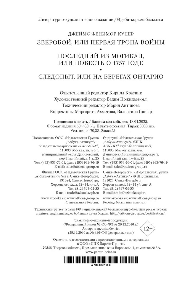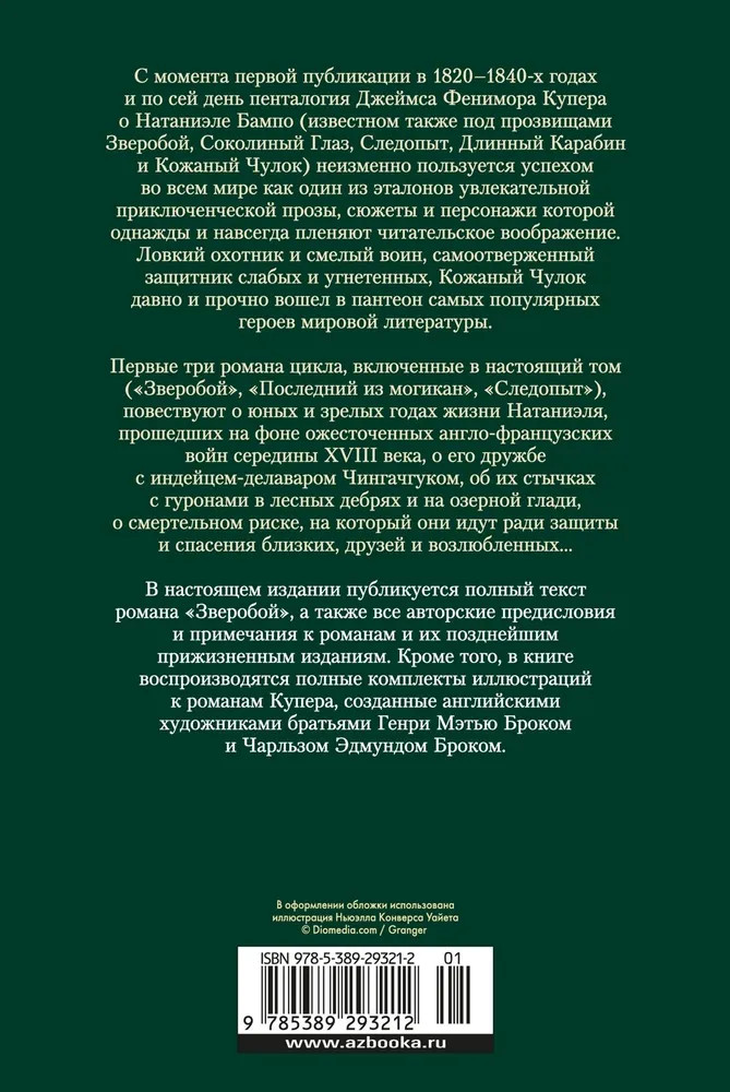 💳 Оплатить за товар можно при получении 🇰🇿 Есть бесплатная доставка по Казахстану от 1 дня 🎁 Копите бонусы с каждой покупки Серия: Мир приключений. Большие книги С момента первой публикации в 1820–1840-х годах и по сей день пенталогия Джеймса Фенимора Купера о Натаниэле Бампо (известном также под прозвищами Зверобой, Соколиный Глаз, Следопыт, Длинный Карабин и Кожаный Чулок) неизменно пользуется успехом во всем мире как один из эталонов увлекательной приключенческой прозы, сюжеты и персонажи которой однажды и навсегда пленяют читательское воображение. Ловкий охотник и смелый воин, самоотверженный защитник слабых и угнетенных, Кожаный Чулок давно и прочно вошел в пантеон самых популярных героев мировой литературы. |