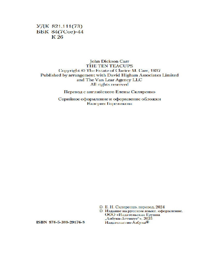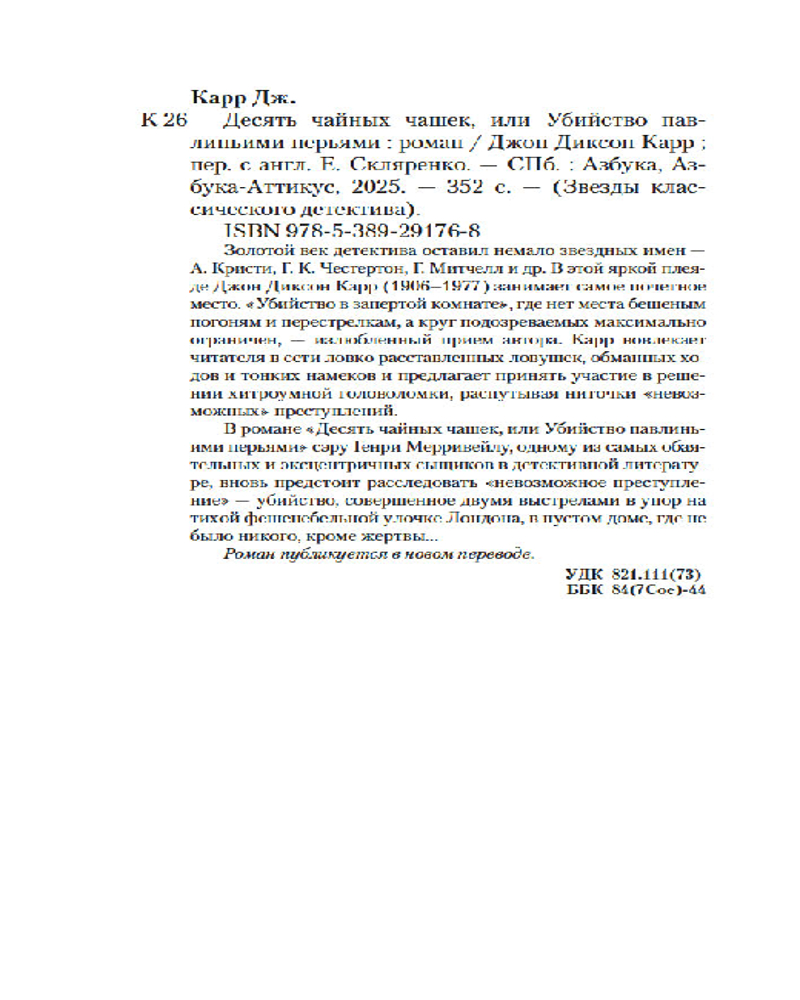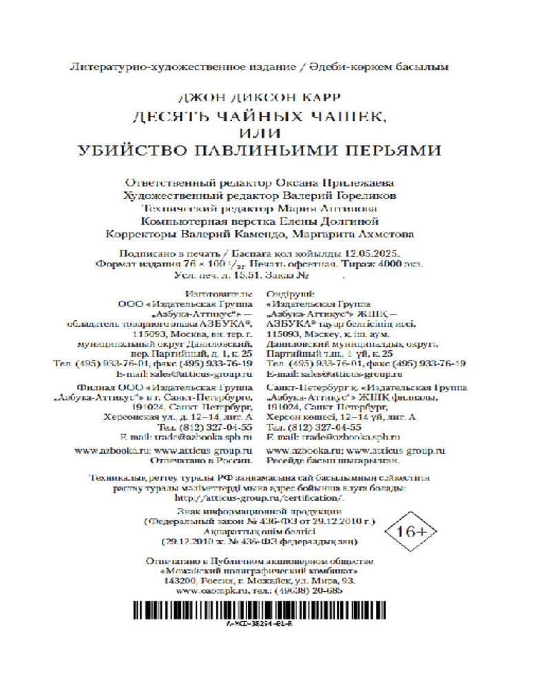💳 Оплатить за товар можно при получении 🇰🇿 Есть бесплатная доставка по Казахстану от 1 дня 🎁 Копите бонусы с каждой покупки Серия: Звезды классического детектива (мягкая обложка) Золотой век детектива оставил немало звездных имен — А. Кристи, Г. К. Честертон, Г. Митчелл и др. В этой яркой плеяде Джон Диксон Карр (1906–1977) занимает самое почетное место. «Убийство в запертой комнате», где нет места бешеным погоням и перестрелкам, а круг подозреваемых максимально ограничен, — излюбленный прием автора. Карр вовлекает читателя в сети ловко расставленных ловушек, обманных ходов и тонких намеков и предлагает принять участие в решении хитроумной головоломки, распутывая ниточки «невозможных» преступлений. |
