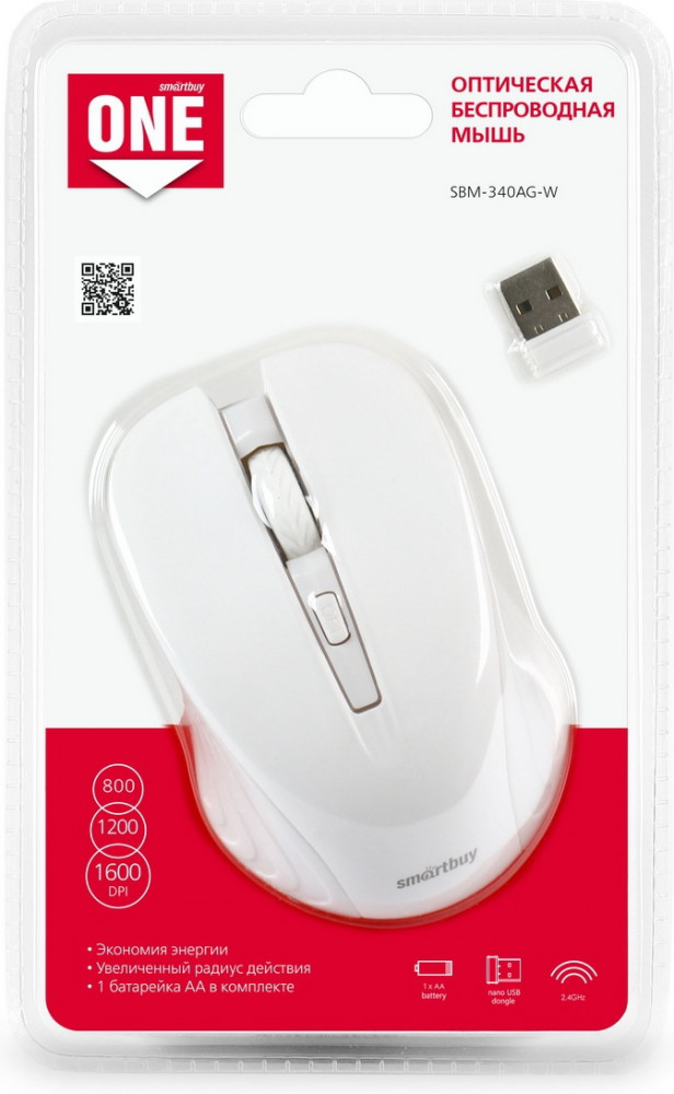 Беспроводная мышь Smartbuy ONE 340AG имеет универсальный хват и подойдет как для левши, так и для правши. Пластиковый корпус сочетает в себе элементы с глянцевым и матовым покрытием. Основное преимущество этой модели заключается в ее беспроводном подключении: вечно путающиеся кабели не будут сковывать ваши движения во время работы за компьютером. Идущий в комплекте USB-ресивер имеет стандартный радиус действия беспроводной связи, равняющийся 10 метрам. Питается компьютерная мышь от одной батарейки AA.