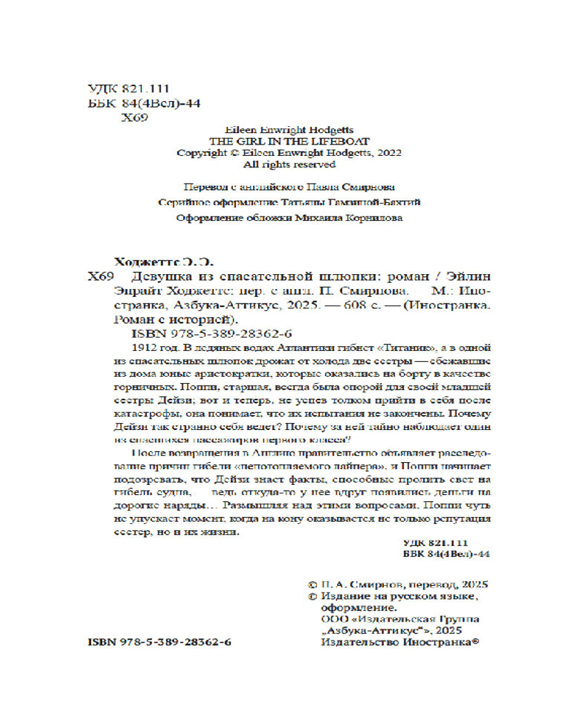 Серия: Роман с историей 1912 год. В ледяных водах Атлантики гибнет «Титаник», а в одной из спасательных шлюпок дрожат от холода две сестры — сбежавшие из дома юные аристократки, которые оказались на борту в качестве горничных. Поппи, старшая, всегда была опорой для своей младшей сестры Дейзи; вот и теперь, не успев толком прийти в себя после катастрофы, она понимает, что их испытания не закончены. Почему Дейзи так странно себя ведет? Почему за ней тайно наблюдает один из спасшихся пассажиров первого класса? |