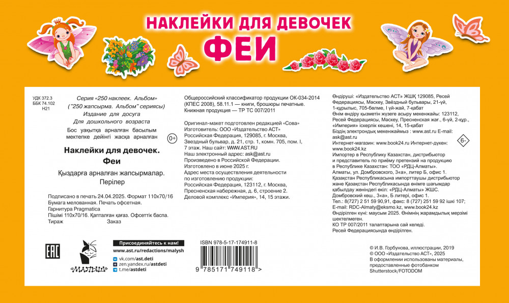 💳 Оплатить за товар можно при получении 🇰🇿 Есть бесплатная доставка по Казахстану от 1 дня 🎁 Копите бонусы с каждой покупки Серия: 250 наклеек. Альбом «Наклейки для девочек. Феи» — это более 250 стикеров и 6 страниц цветных фонов для безграничной детской фантазии. Играя с книжкой, девочки смогут совершить настоящее путешествие в волшебный мир дворцов и замков, уголков волшебного леса, широких мраморных лестниц, аллей королевского сада. Чудесные иллюстрации — простор для фантазии и воображения + коллекция наклеек, которые помогут оживить сказку и создать собственную неповторимую книгу. Все сюжеты — на мелованных страницах отличного качества, поэтому стикеры можно наклеивать много раз! Для дошкольного возраста. |