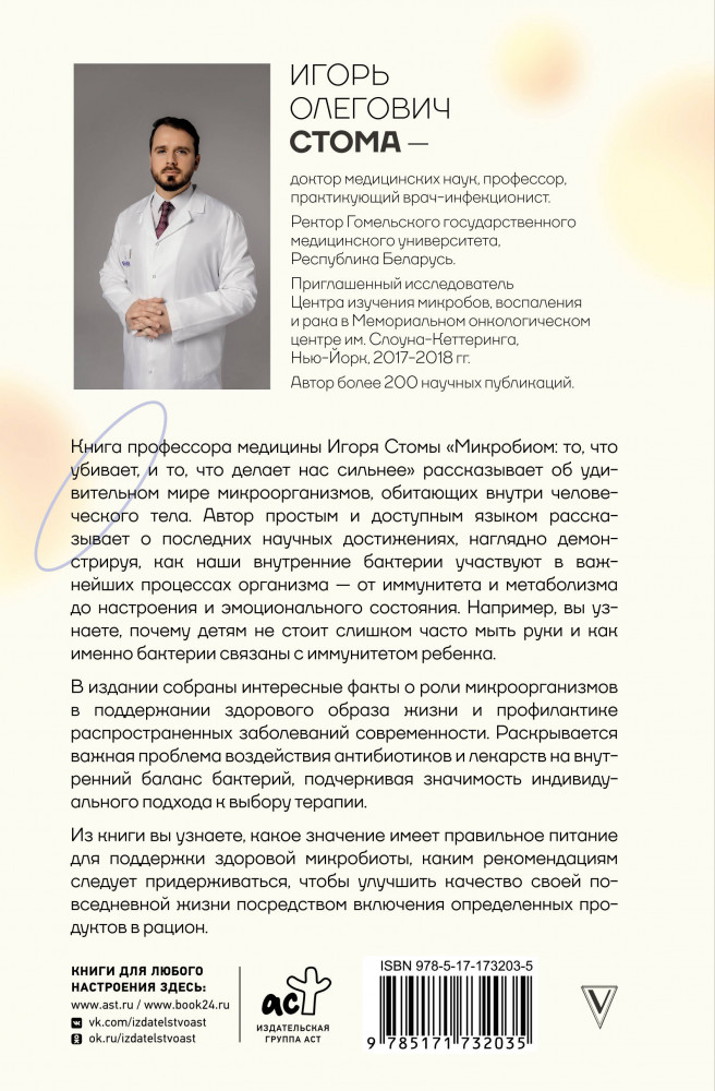 💳 Оплатить за товар можно при получении 🇰🇿 Есть бесплатная доставка по Казахстану от 1 дня 🎁 Копите бонусы с каждой покупки Серия: Медицина рунета Книга профессора медицины Игоря Стомы «Микробиом: то, что убивает, и то, что делает нас сильнее» рассказывает об удивительном мире микроорганизмов, обитающих внутри человеческого тела. Автор простым и доступным языком рассказывает о последних научных достижениях, наглядно демонстрируя, как наши внутренние бактерии участвуют в важнейших процессах организма — от иммунитета и метаболизма до настроения и эмоционального состояния. Например, вы узнаете, почему детям не стоит слишком часто мыть руки, и как именно бактерии связаны с иммунитетом ребенка. |