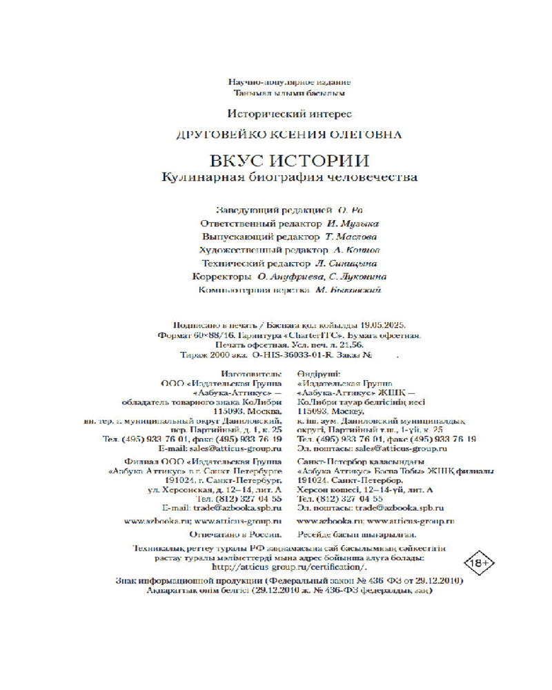 💳 Оплатить за товар можно при получении 🇰🇿 Есть бесплатная доставка по Казахстану 🎁 Копите бонусы с каждой покупки Серия: Исторический интерес Научный журналист Ксения Друговейко увлекательно рассказывает о том, как появление самых популярных блюд, продуктов и ингредиентов связано с поворотными моментами человеческой истории. Автор в живой манере и с отличным чувством юмора предлагает читателю взглянуть на биографию человечества через историю еды. Неочевидная связь кулинарии с наукой, политикой, войной, торговлей и дипломатией заставляет посмотреть на привычные рецепты и постоянных спутников наших застолий с любопытством и уважением. |