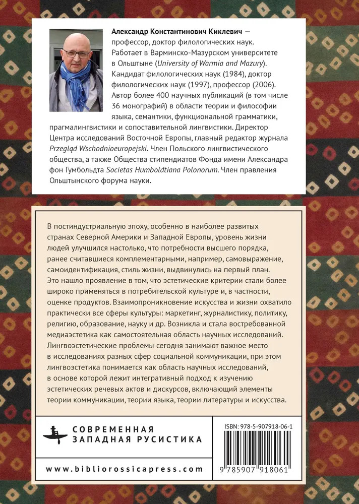 💳 Оплатить за товар можно при получении 🇰🇿 Есть бесплатная доставка по Казахстану от 1 дня 🎁 Копите бонусы с каждой покупки Серия: Современная западная русистика В постиндустриальную эпоху, особенно в наиболее развитых странах Северной Америки и Западной Европы, уровень жизни людей улучшился настолько, что потребности высшего порядка, ранее считавшиеся комплементарными, например, самовыражение, самоидентификация, стиль жизни, выдвинулись на первый план. Это нашло проявление в том, что эстетические критерии стали более широко применяться в потребительской культуре и, в частности, оценке продуктов. Взаимопроникновение искусства и жизни охватило практически все сферы культуры: маркетинг, журналистику, политику, религию, образование, науку и др. Возникла и стала востребованной медиаэстетика как самостоятельная область научных исследований. Лингвоэстетические проблемы сегодня занимают важное место в исследованиях разных сфер социальной коммуникации, при этом лингвоэстетика понимается как область научных исследований, в основе которой лежит интегративный подход к изучению эстетических речевых актов и дискурсов, включающий элементы теории коммуникации, теории языка, теории литературы и искусства. |