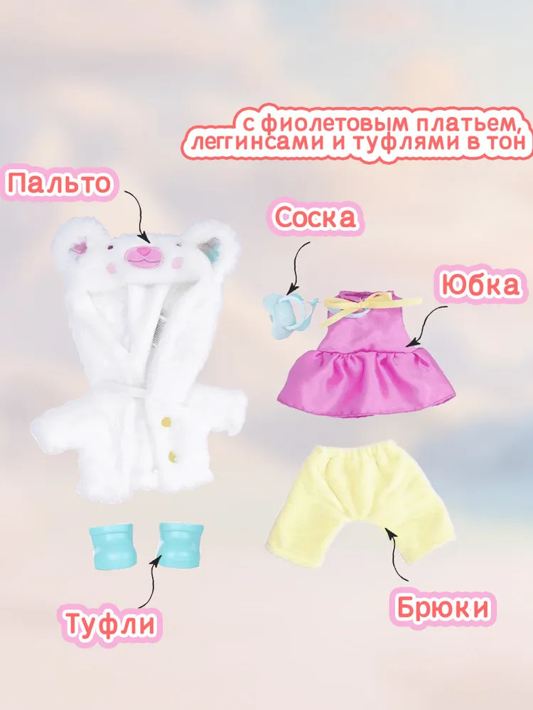 • аксессуары в комплекте: съёмная одежда, туфельки и соска — всё, что нужно для увлекательной игры;