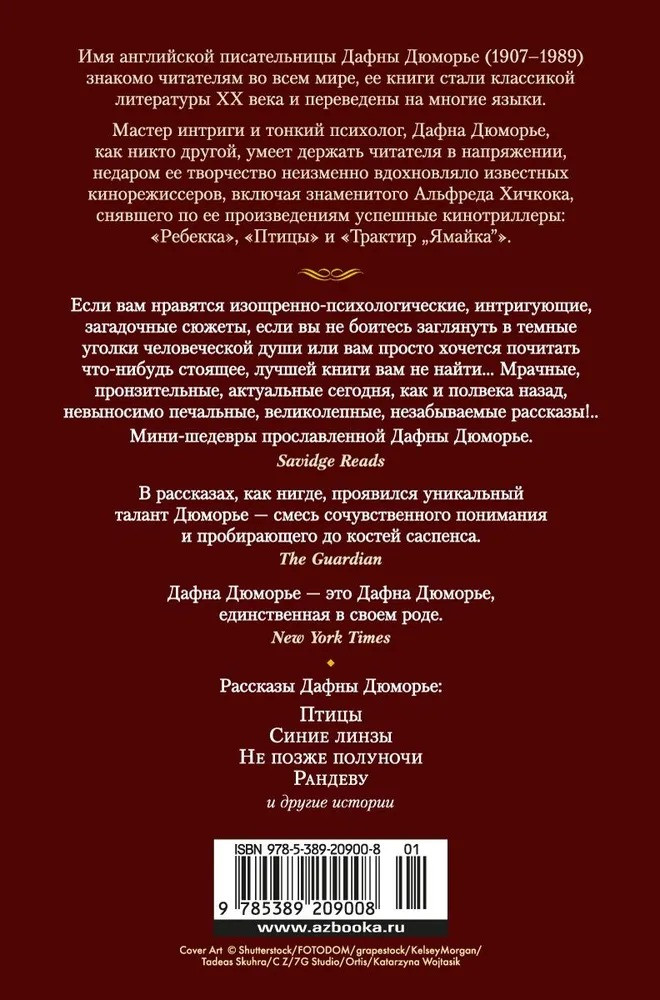 💳 Оплатить за товар можно при получении 🇰🇿 Есть бесплатная доставка по Казахстану от 1 дня 🎁 Копите бонусы с каждой покупки Серия: Иностранная литература. Большие книги Имя английской писательницы Дафны Дюморье (1907-1989) знакомо читателям во всем мире, ее книги стали классикой литературы ХХ века и переведены на многие языки. Мастер интриги и тонкий психолог, Дафна Дюморье, как никто другой, умеет держать читателя в напряжении, недаром ее творчество неизменно вдохновляло известных кинорежиссеров, включая знаменитого Альфреда Хичкока, снявшего по ее произведениям успешные кинофильмы: «Ребекка», «Птицы» и «Трактир «Ямайка». За долгую творческую жизнь Дафна Дюморье выпустила полтора десятка романов, пьесы, романизированные биографии и книгу о Корнуолле, а также несколько авторских сборников малой прозы: «Птицы» (в настоящем издании в эту подборку включен также рассказ «Счастливого Рождества», долгое время остававшийся неизвестным русскому читателю), «Синие линзы», «Рандеву» и «Не позже полуночи». Мини-шедевры Дафны Дюморье, отражая многогранный талант автора, ошеломляют исключительным разнообразием тем, сюжетов и настроений, но остаются в равной мере оригинальными и увлекательными, как и все, что выходило из-под пера Дюморье. |