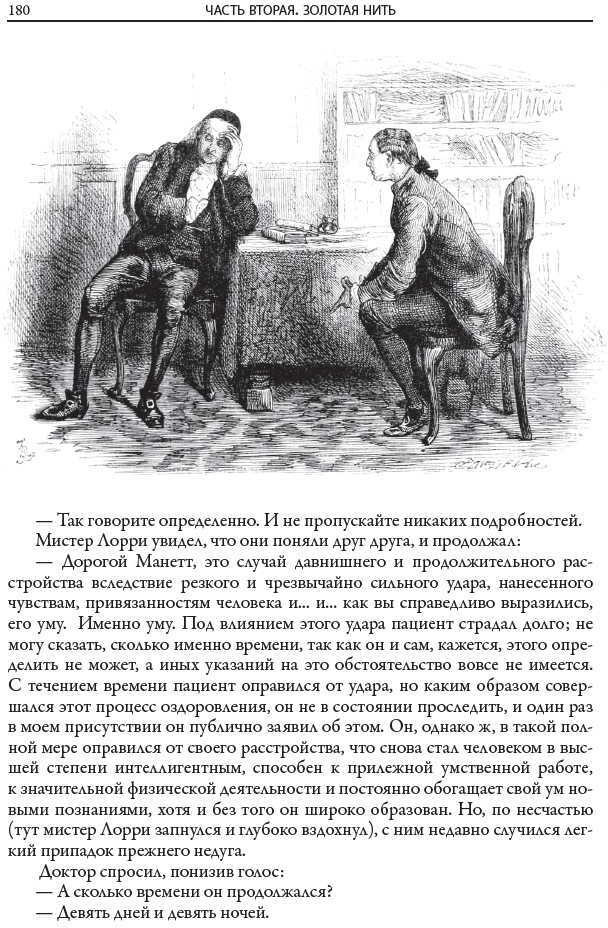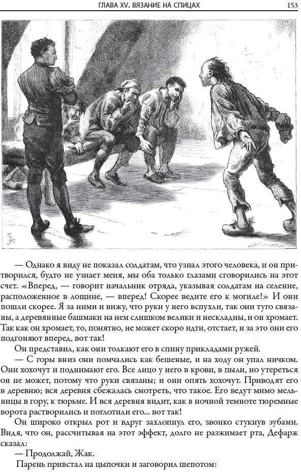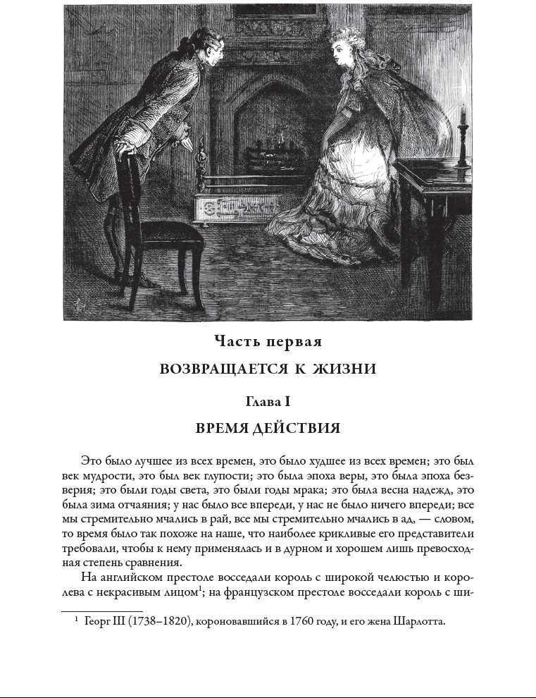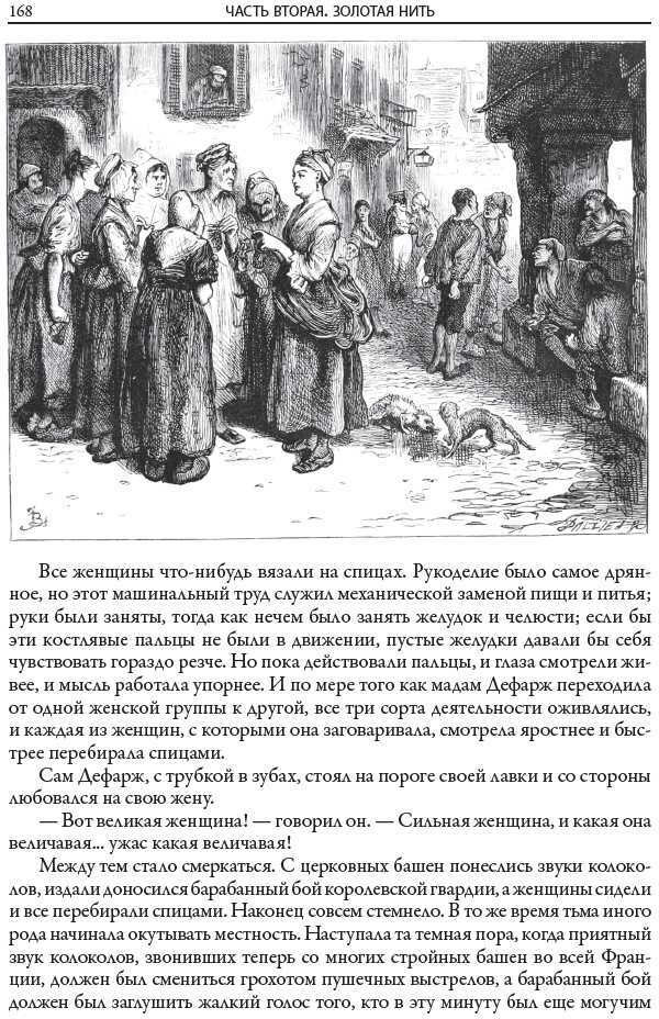 «Повесть о двух городах» — не историческая хроника, это роман о дружбе, любви и ненависти, о возвышенных и о низменных человеческих чувствах. Диккенс описывает их мастерски. Именно поэтому это его произведение стало на родине писателя классикой. Роман неоднократно переиздавали и экранизировали. Издание украшают рисунки британского художника Фредерика Барнарда. В последней трети XIX в. Он проиллюстрировал девятитомное собрание сочинений Диккенса, опубликованное британским издательством «Чепмен энд Холл». Перед Барнардом стояла непростая задача, ведь англичане уже были знакомы с прекрасными иллюстрациями ко многим произведениям Диккенса, которые выполнил британский художник и друг самого писателя Хэблот Браун. Отдавая должное таланту Брауна, Барнард пошел своим путем. Он сделал акцент на тщательной прорисовке отдельных персонажей, словно бы приближая к ним зрителя, делая его невидимым участником изображаемых сцен. Такой прием прекрасно сработал. За тщательность прорисовки деталей и верную передачу диккенсовской атмосферы Барнарда со временем стали называть «Диккенсом среди графиков». |
