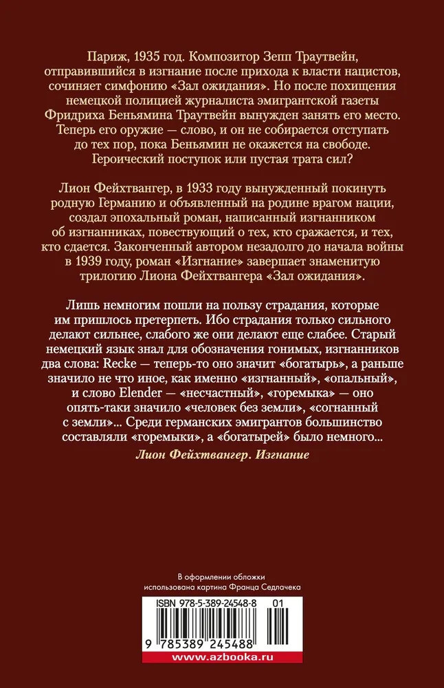 Зал ожидания. Книга 3. ИзгнаниеВ данный момент этот товар отсутствует в продаже. Возможно, у нас найдется аналогичный или похожий товар здесь. Серия: Иностранная литература. Большие книги Париж, 1935 год. Композитор Зепп Траутвейн, отправившийся в изгнание после прихода к власти нацистов, сочиняет симфонию «Зал ожидания». Но после похищения немецкой полицией журналиста эмигрантской газеты Фридриха Беньямина Траутвейн вынужден занять его место. Теперь его оружие — слово, и он не собирается отступать до тех пор, пока Беньямин не окажется на свободе. Героический поступок или пустая трата сил? |