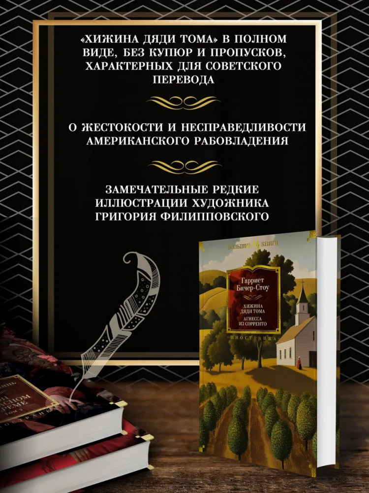 💳 Оплатить за товар можно при получении 🇰🇿 Есть бесплатная доставка по Казахстану от 1 дня 🎁 Копите бонусы с каждой покупки Серия: Иностранная литература. Большие книги Роман «Хижина дяди Тома» американской писательницы Гарриет Бичер-Стоу (1811–1896) очень быстро приобрел мировую известность и признание. Написанная в характерном для XIX века сентиментальном стиле «женской прозы», эта книга произвела грандиозный переворот в общественных настроениях, завоевав важное место не только в истории литературы, но и в культурной и политической истории Соединенных Штатов Америки. В настоящем издании роман «Хижина дяди Тома» представлен в полном виде, без купюр и пропусков, характерных для советского перевода, а также сопровождается замечательными редкими иллюстрациями художника Григория Филипповского (1909–1987). Также в книгу вошел религиозно-исторический роман «Агнесса из Сорренто», изданный спустя десять лет после «Хижины дяди Тома». Действие романа происходит в солнечной Италии в конце XV века, во времена правления печально известного папы Александра Шестого. Прекрасная, юная Агнесса мечтает посвятить себя служению Богу, уйдя в монастырь. Однако ее красота привлекает настойчивое внимание мужчин, среди которых — молодой предводитель разбойников, отлученный от церкви, и суровый настоятель монастыря… |