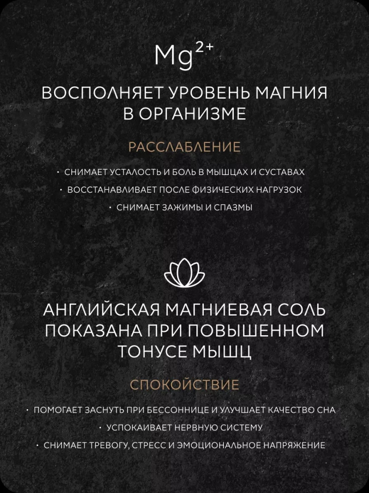 Магниевая соль «Epsom» — натуральный источник здоровья и красоты. Английская соль — это уникальное средство для заботы о вашем организме. Она на 99% состоит из сульфата магния и обладает высочайшей степенью очистки, что делает ее незаменимой для поддержания здоровья и хорошего самочувствия. Эта натуральная соль — идеальный выбор для тех, кто ищет эффективное и безопасное средство для ухода за телом. Благодаря своему богатому составу магниевая соль активно насыщает организм магнием, что особенно важно для поддержания правильной работы мышц и суставов.