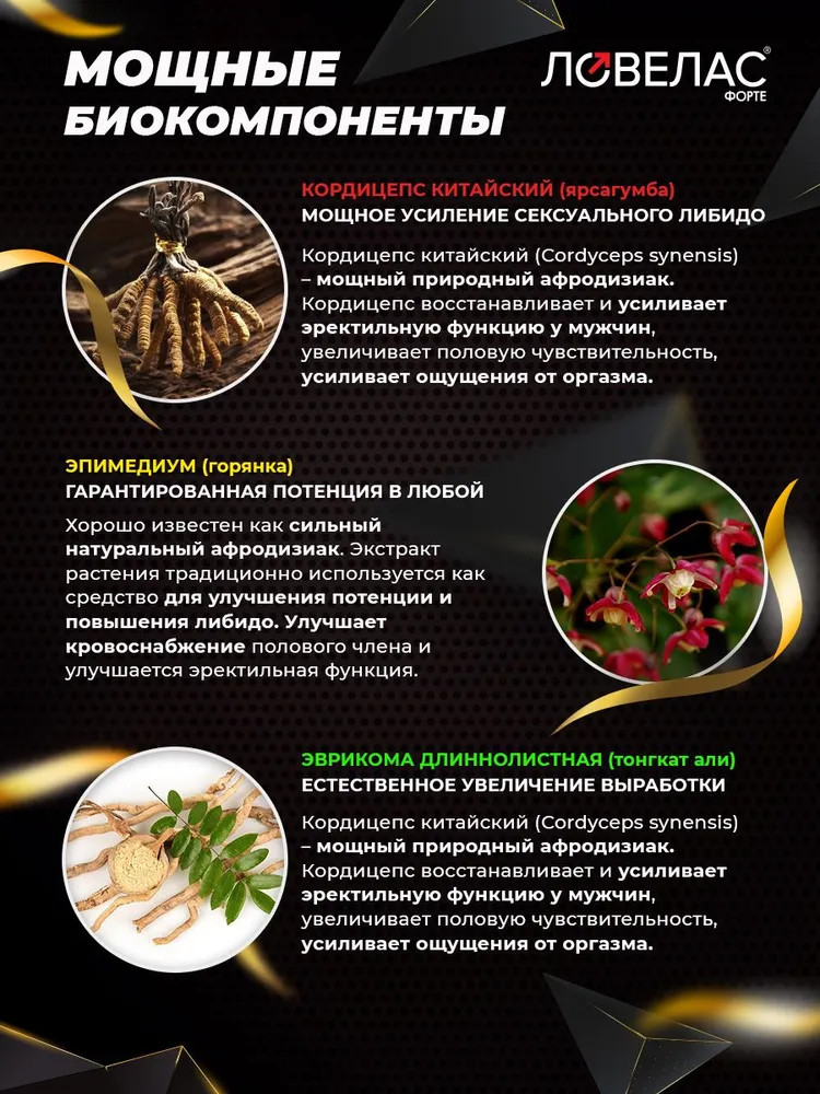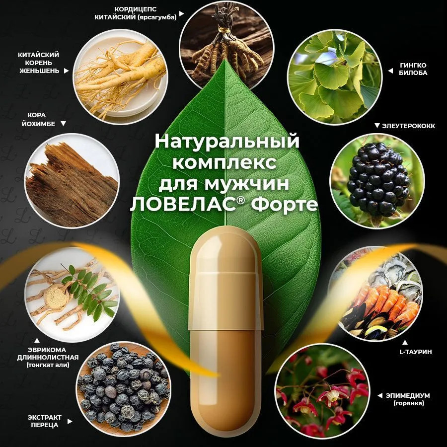 Биологически активная добавка к пище Ловелас Форте — новая разработка для стимуляции и усиления либидо и улучшения эрекции. Предназначен для активных мужчин, желающих приумножить свои сексуальные победы и достижения. Компоненты Ловелас Форте взаимно дополняют друг друга и оказывают максимальный эффект. Это позволит мужчине на протяжении длительного времени сохранять активное сексуальное желание и способность к его удовлетворению. Ловелас Форте способствует эффективному поддержанию эректильной функции, продлевает половой акт и усиливает сексуальную чувствительность. Действие Ловелас Форте активно поддерживает либидо и половое здоровье мужчины в течение суток на протяжении всего срока употребления. Максимальный эффект достигается при курсовом приеме.