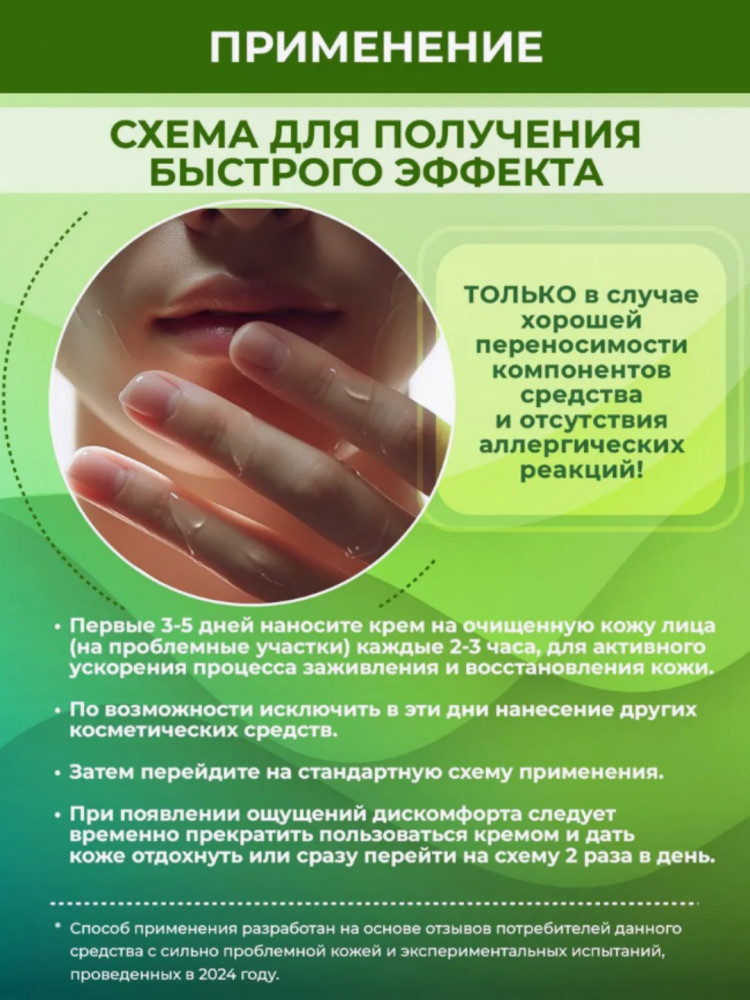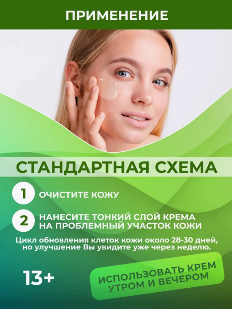 Способ применения: после очистки лица нанести равномерным слоем на лицо в местах поражения нанести немного больше, избегайте области вокруг глаз, применять утром и вечером. Примечание желательно в период применения не есть острую, горькую, жирную, пищу. Не желательно применять на здоровой сухой коже. |