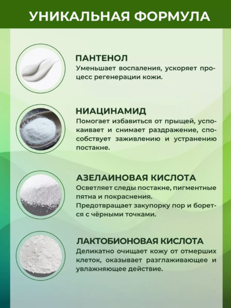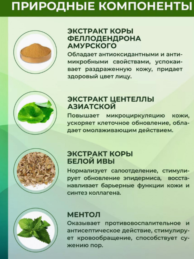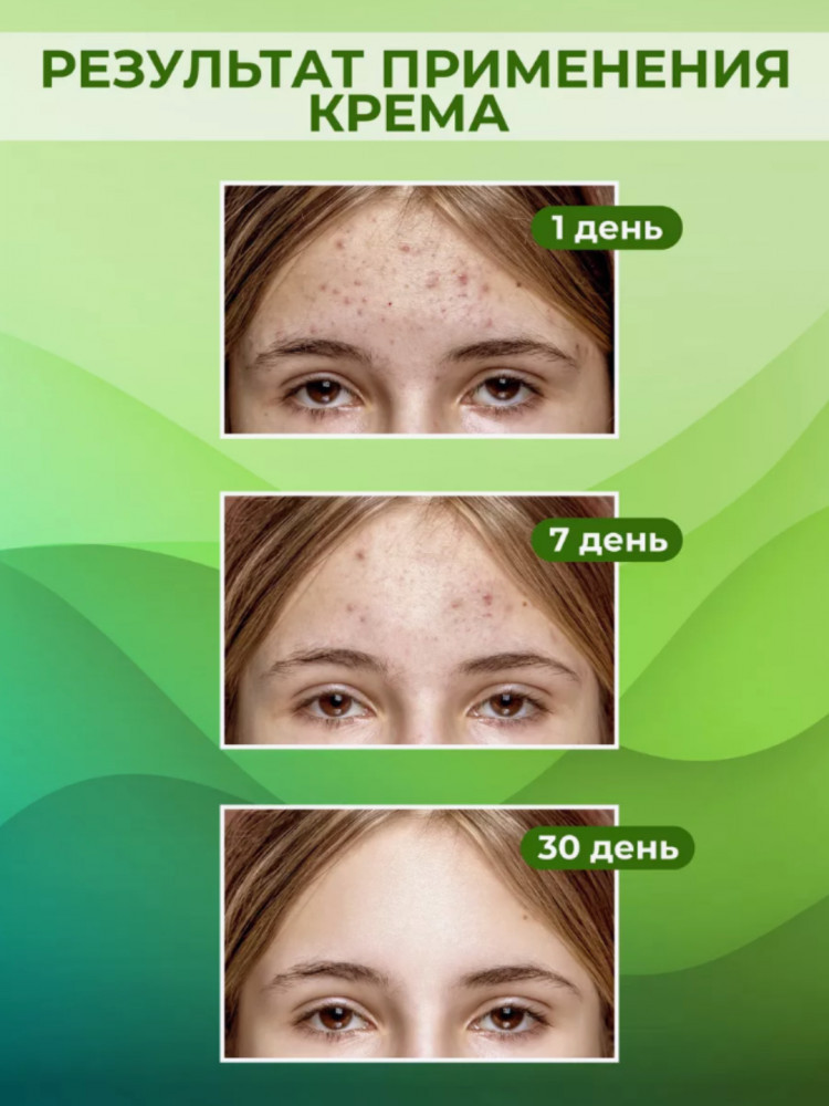 Зеленый крем: снимает воспаление прыщей, контролирует жирность лица, успокаивает кожу, удаляет следы прыщей.