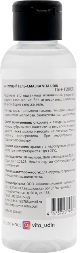 VITA UDIN — это лубрикант на водной основе высокого качества, который обеспечивает длительное скольжение и комфорт во время интимных отношений. Он создан на основе натуральных компонентов, не содержит парабенов и других вредных веществ. С VITA UDIN вы можете наслаждаться более продолжительным и приятным сексом, а также улучшить свою интимную жизнь, добавив сексигрушки, эротические игры и возбуждающий массаж. Лубрикант VITA UDIN — интимный гель смазка дает ощутимый мгновенный результат, гладкое скольжение без агрессивных химический веществ.