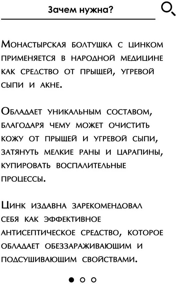 Бизорюк Болтушка для лица «Монастырская с цинком»В данный момент этот товар отсутствует в продаже. Возможно, у нас найдется аналогичный или похожий товар здесь. Серия: Солох-аул Монастырская болтушка с цинком применяется в народной медицине как средство от прыщей, угревой сыпи и акне. Обладает уникальным составом, благодаря чему может очистить кожу от прыщей и угревой сыпи, затянуть мелкие раны и царапины, купировать воспалительные процессы. Цинк издавна зарекомендовал себя как эффективное антисептическое средство, которое обладает обеззараживающим и подсушивающим свойствами. А растительные масла и настои в составе болтушки применяются в народной медицине для дезинфицирования и смягчения кожного покрова, тем самым создавая своеобразный защитный слой, что способствует профилактике нежелательных проявлений. |