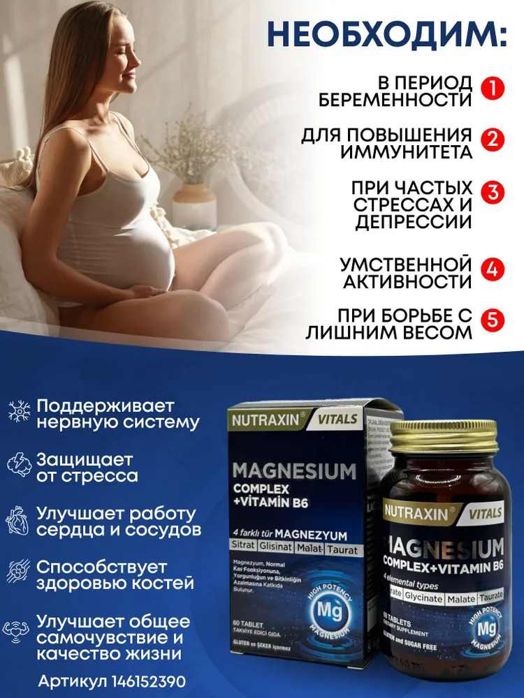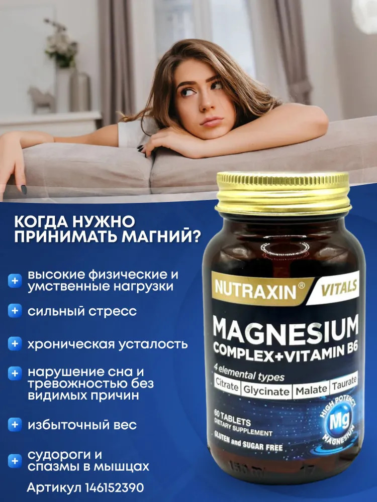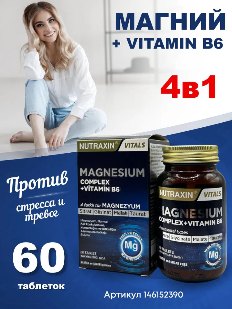 В данный момент этот товар отсутствует в продаже. Возможно, у нас найдется аналогичный или похожий товар здесь. Nutraxin Magnesium + Vitamin B6 — это витаминный комплекс состоящий из хелата магния в 4 различных формах (малат, бисглицинат, таурат и цитрат) и витамина В6. Содержит 125 мг минерала магния и 10 мг витамина В6 в одной таблетке. Имеет международные сертификаты GMP и HACCP.