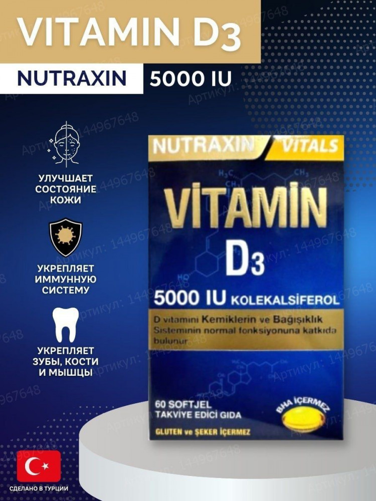 Холекальциферол — форма витамина Д3, абсолютно идентичная тому, что вырабатывает наш организм под воздействием солнечного света. Поэтому NUTRAXIN «Витамин D3 (5000 МЕ)» полностью усваивается нашим организмом и максимально эффективно оказывает поддержку всем системам организма. Основная роль витамина Д заключается в его содействии усвоению кальция. Недостаток витамина Д приводит к тому, что человек, употребляющий достаточное количество кальция, все равно не получает нужного эффекта: его кости и зубы остаются хрупкими. Помимо этого витамин Д3 также играет большую роль в поддержании здоровья иммунной системы, а также таких жизненно важных органов как: поджелудочная, молочная и предстательная железа. С возрастом выработка витамина Д значительно снижается, а учитывая, что на большей части территории нашей страны количество солнечных дней не велико, почти каждый человек нуждается в дополнительном приеме этого витамина.