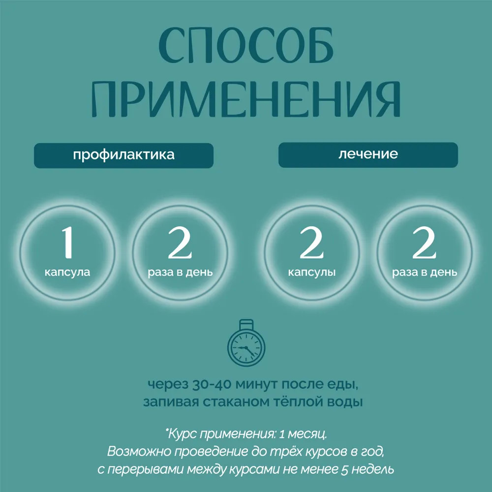 Способ применения: профилактика: по 2 капсулы 2 раза в день через 30-40 минут после еды, запивая стаканом тёплой воды. Лечение: по 2-4 капсулы 3 раза в день через 30-40 минут после еды, запивая стаканом тёплой воды. Курс применения: 1 месяц. Возможно проведение до трёх курсов в год, с перерывами между курсами не менее 5 недель. |