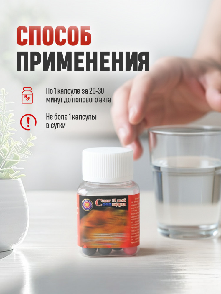 Способ применения: по 1 капсуле за 20–30 минут до интимной близости, не более 1 капсулы в сутки.